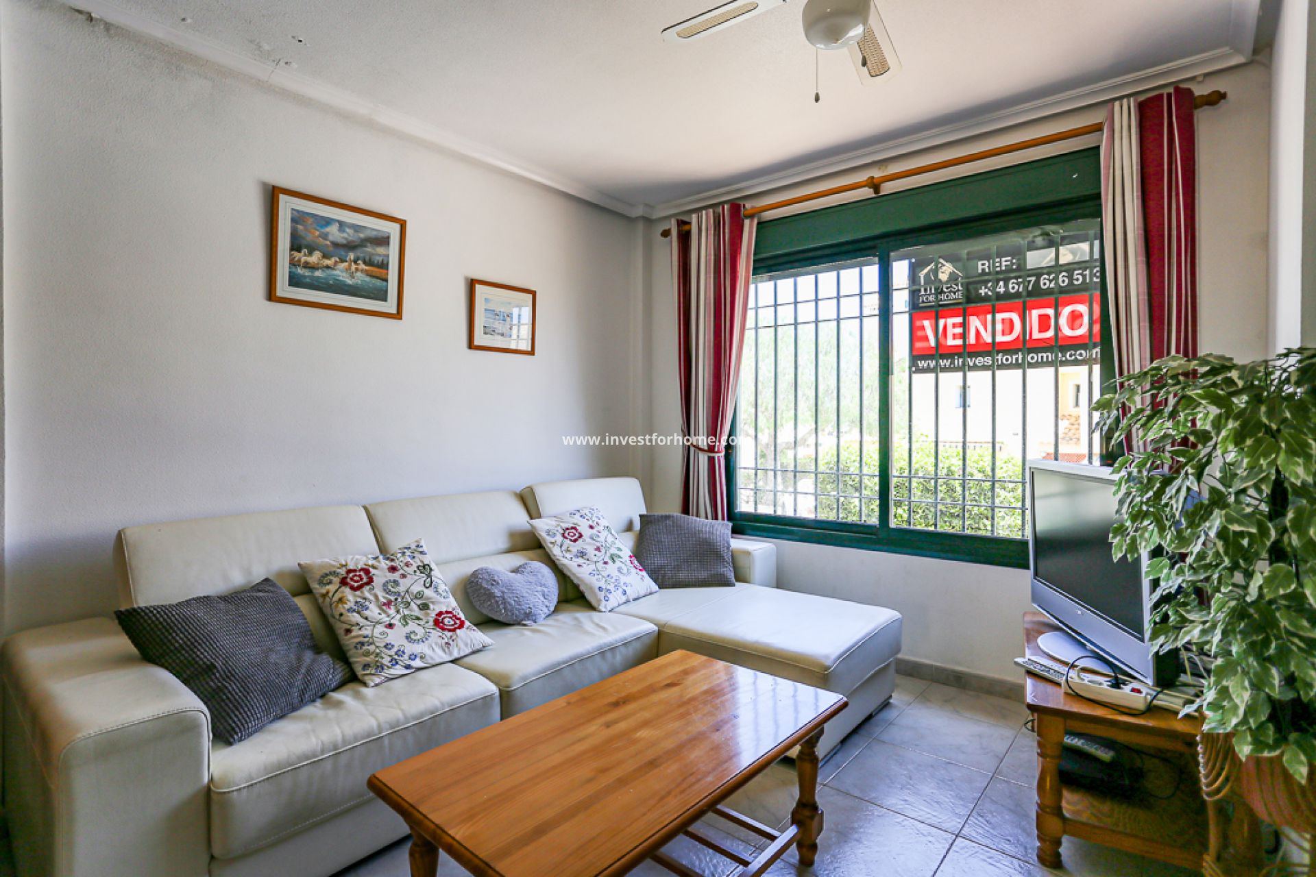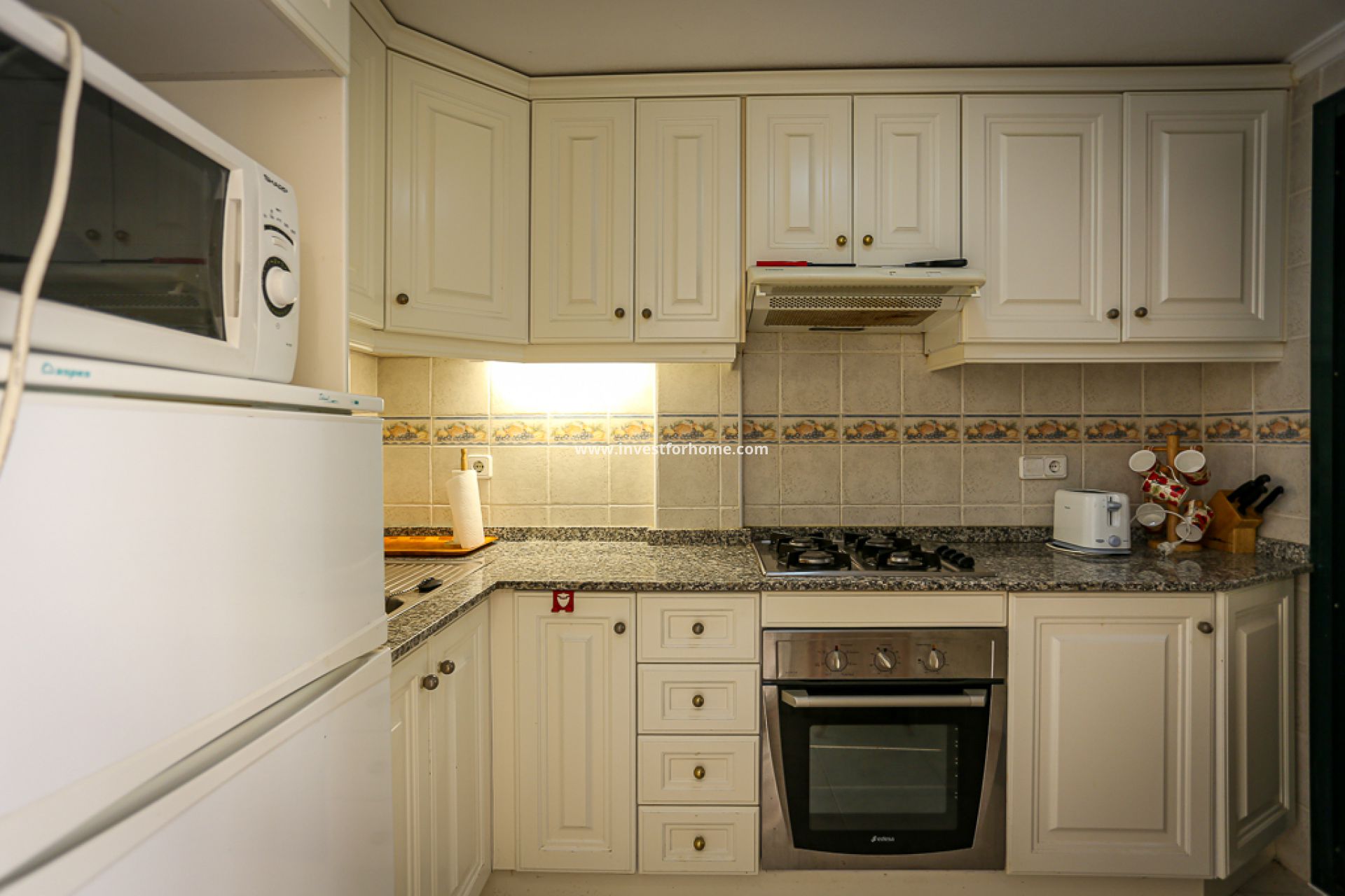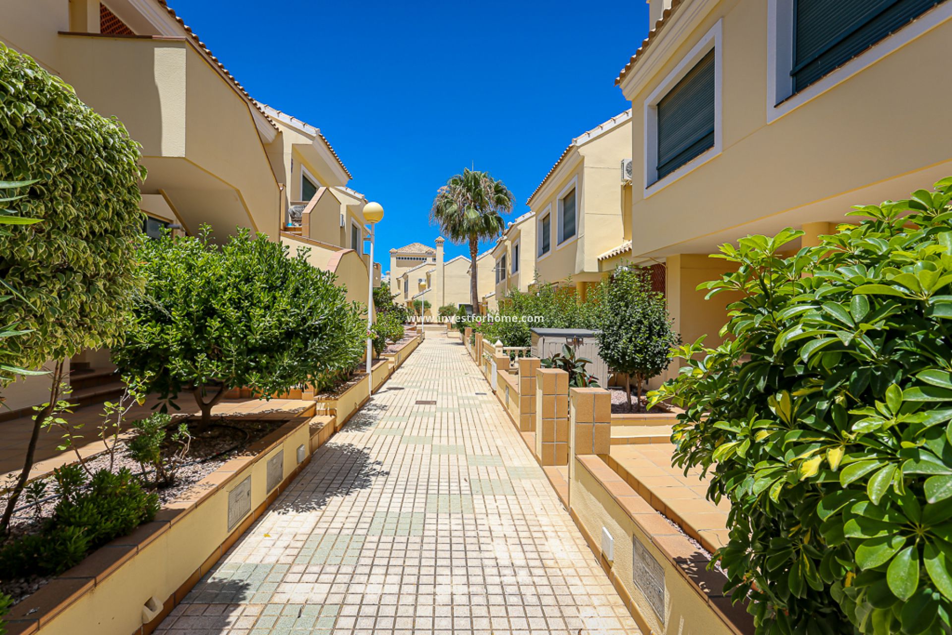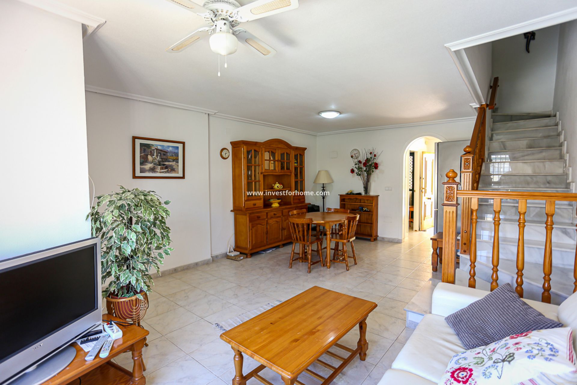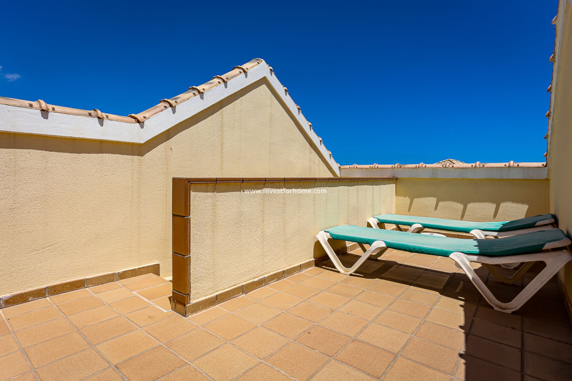 Mooi herenhuis Granada te koop in Lomas de Campoamor (Orihuela Costa) Op een steenworp afstand van de Golf de Campoamor, dit mooie huis met 2 verdiepingen heeft 2 slaapkamers, een met balkon en toegang tot het dakterras, grote woonkamer van 30m² en een ingerichte onafhankelijke keuken.
