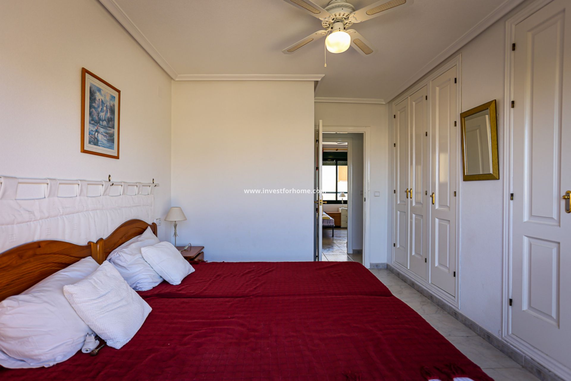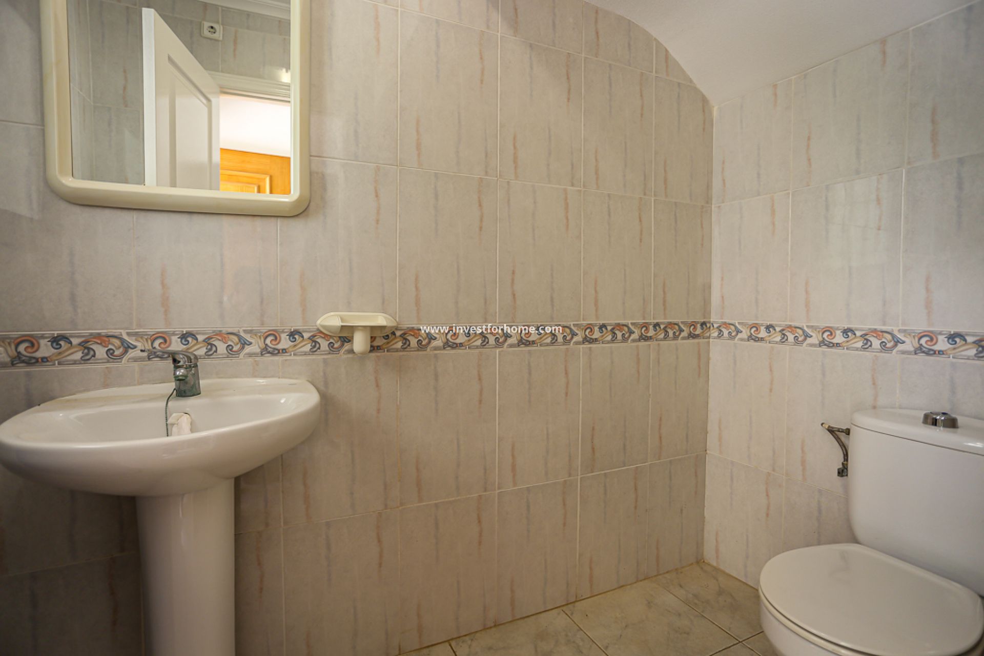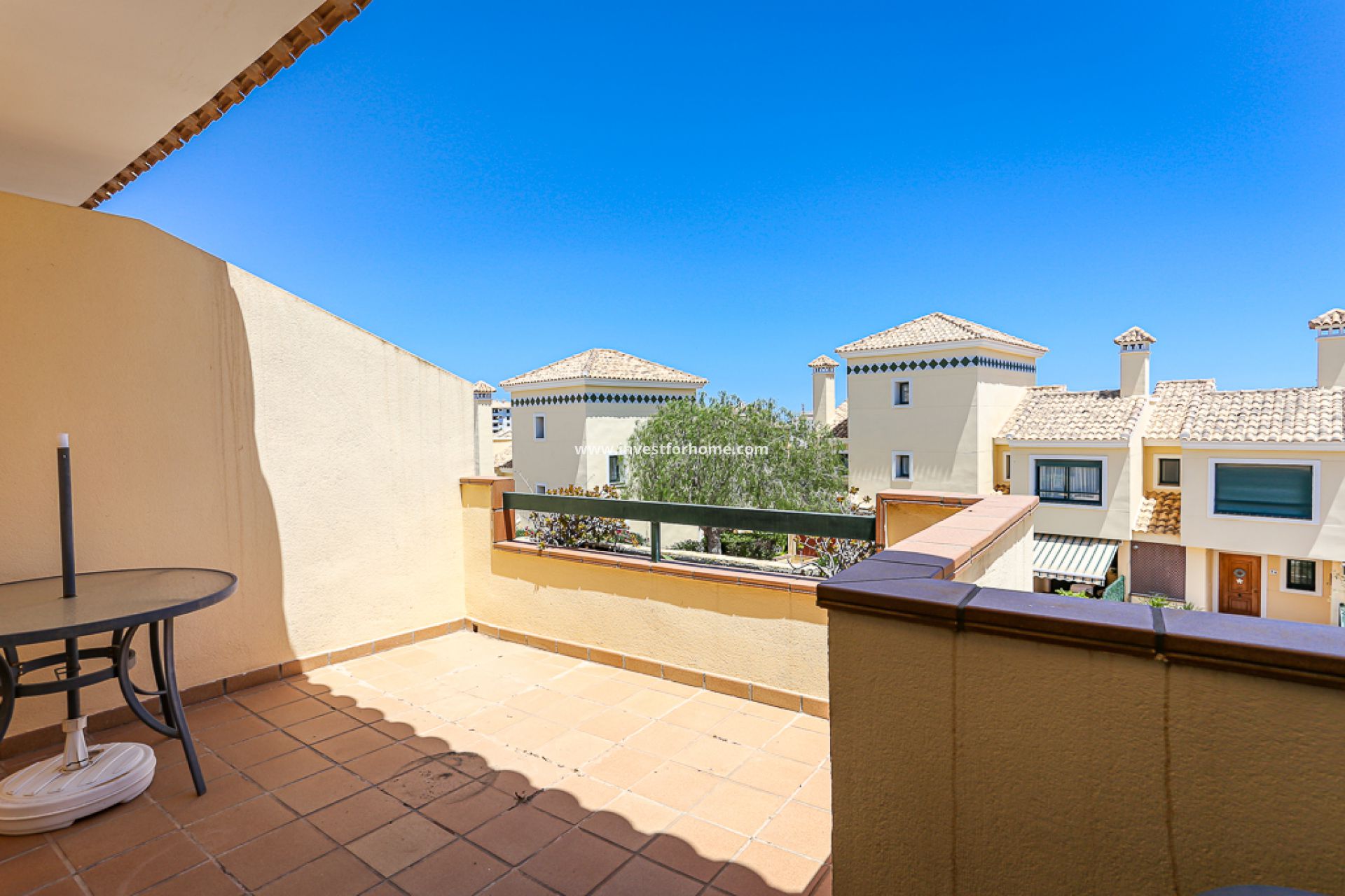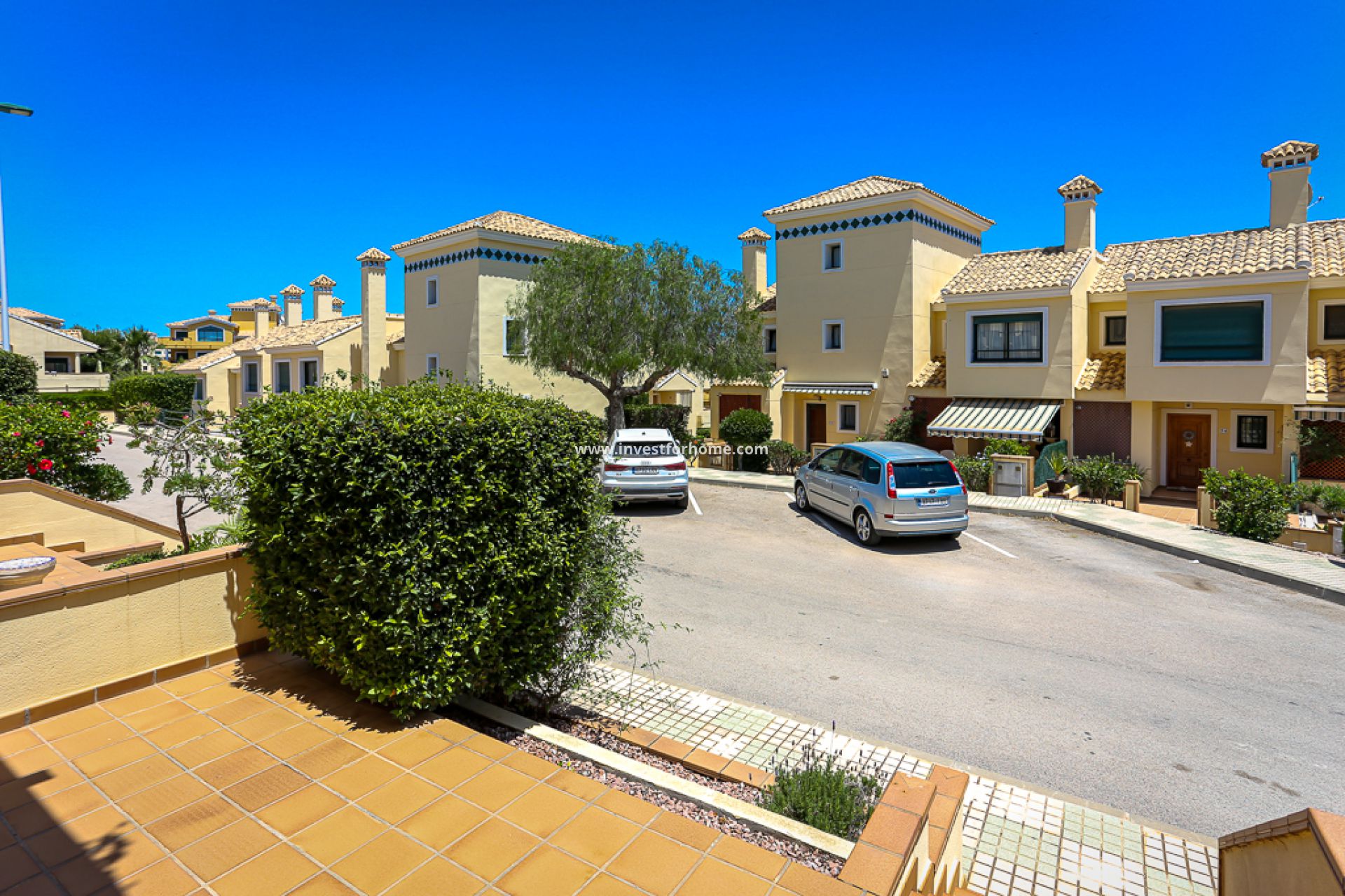 Mooi herenhuis Granada te koop in Lomas de Campoamor (Orihuela Costa) Op een steenworp afstand van de Golf de Campoamor, dit mooie huis met 2 verdiepingen heeft 2 slaapkamers, een met balkon en toegang tot het dakterras, grote woonkamer van 30m² en een ingerichte onafhankelijke keuken.