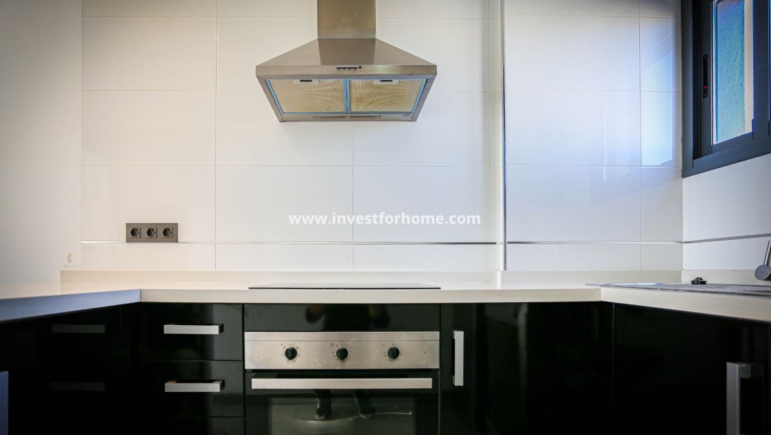 Als we door de deur naar binnen gaan, vinden we aan onze rechterkant een grote lichte woonkamer / keuken aangezien het huis op het zuiden ligt. We kunnen zien dat we vanuit de woonkamer een heel mooi terras hebben, dat ons verbindt met een groot solarium ter grootte van het huis.