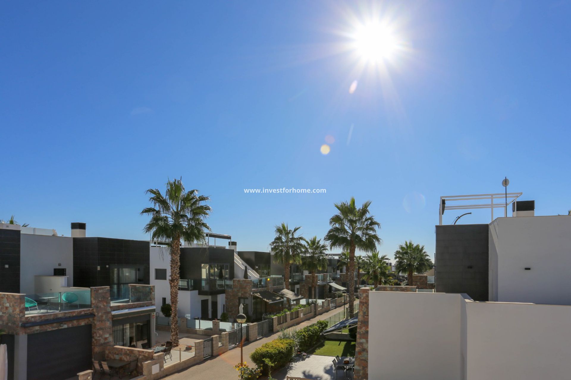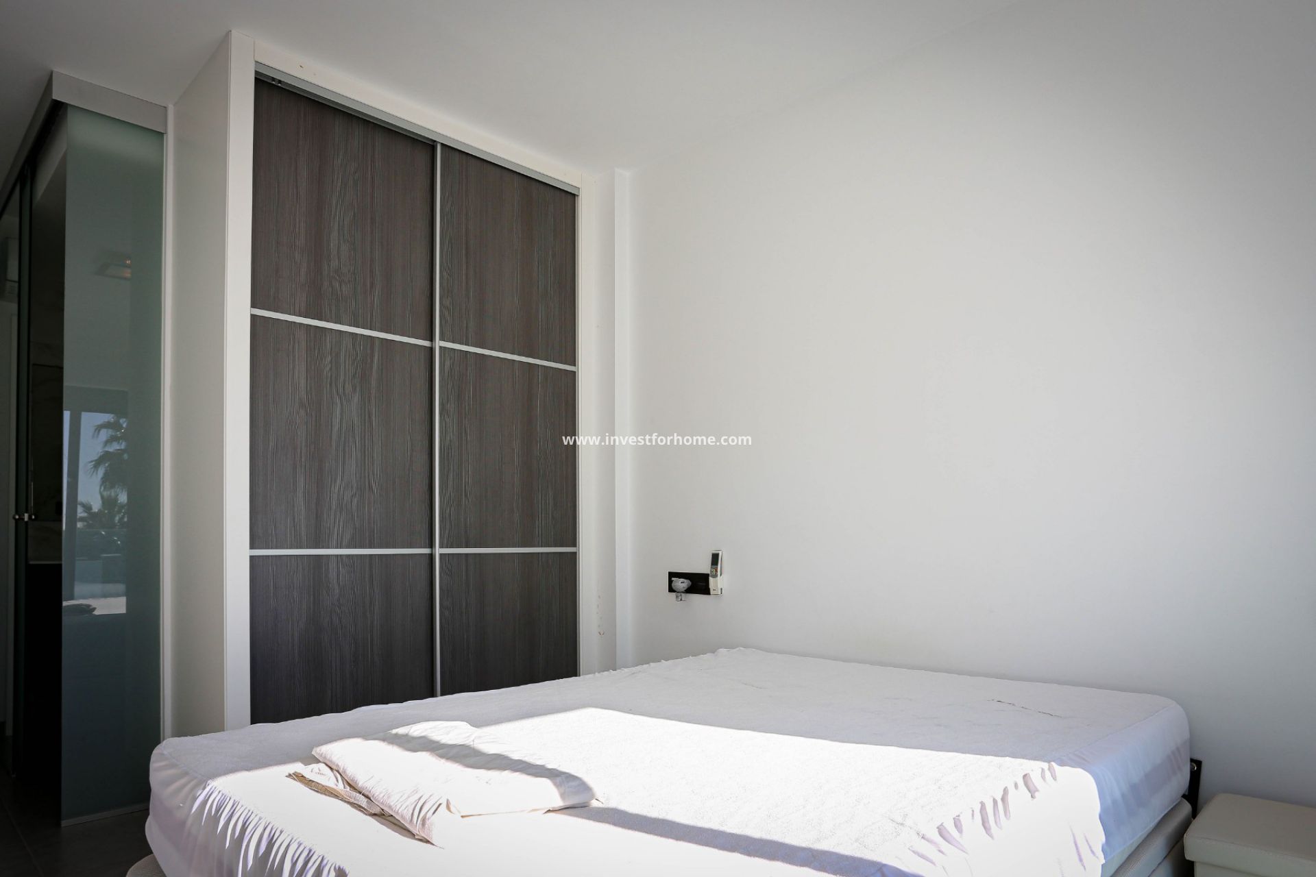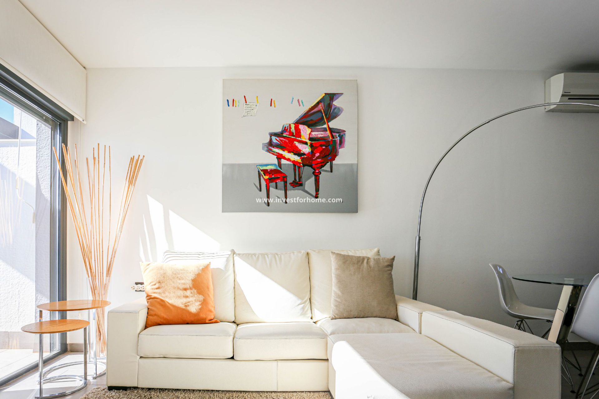 Als we door de deur naar binnen gaan, vinden we aan onze rechterkant een grote lichte woonkamer / keuken aangezien het huis op het zuiden ligt. We kunnen zien dat we vanuit de woonkamer een heel mooi terras hebben, dat ons verbindt met een groot solarium ter grootte van het huis.