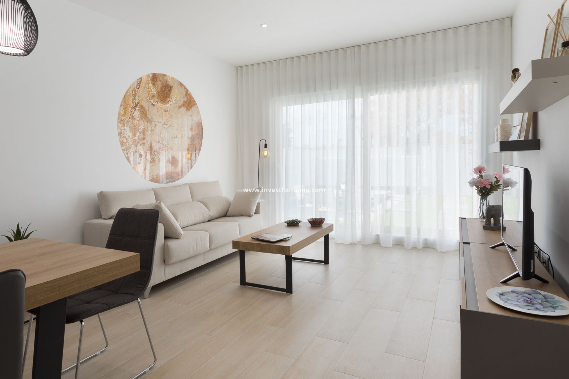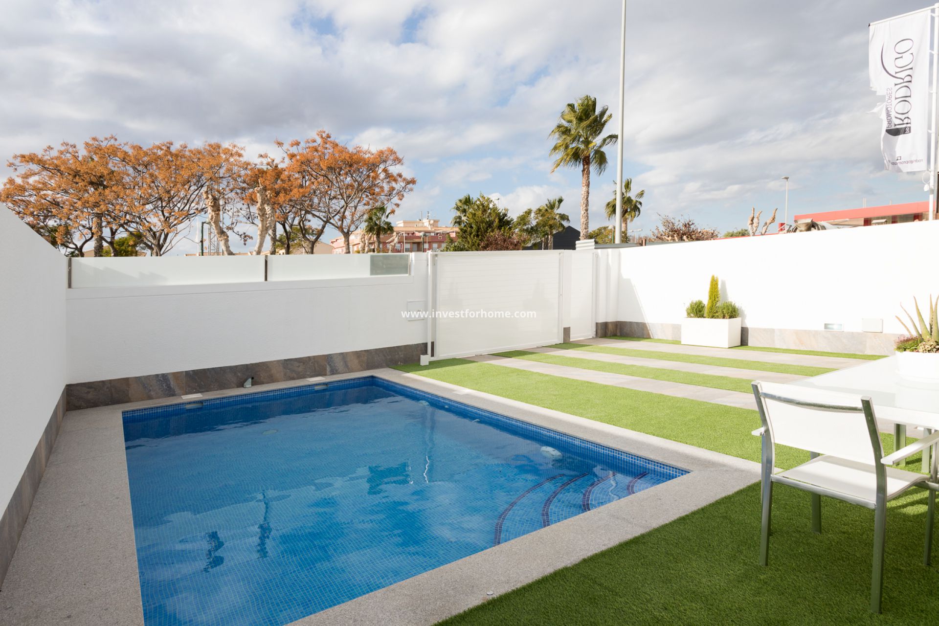 De villa is gelegen in de stad San Pedro del Pinatar , aan de Costa Calida . De villa's liggen dicht bij de stranden van de Middellandse Zee en Mar Menor . Het wordt omringd door alle diensten die u nodig heeft en ligt op slechts 700 m van het stadscentrum. Deze huizen zijn ontworpen in een modern concept en bestaan uit drie slaapkamers, twee volledige badkamers, een keuken volledig uitgerust, een tuin en een privé zwembad. Op de begane grond vindt u een keuken, een lichte woonkamer met toegang tot de privétuin met zwembad en ook een slaapkamer en een badkamer. Op de eerste verdieping zijn er nog 2 slaapkamers en een badkamer, de hoofdslaapkamer met kleedkamer. Vanuit beide slaapkamers heeft u toegang tot een prachtig terras van 19m2