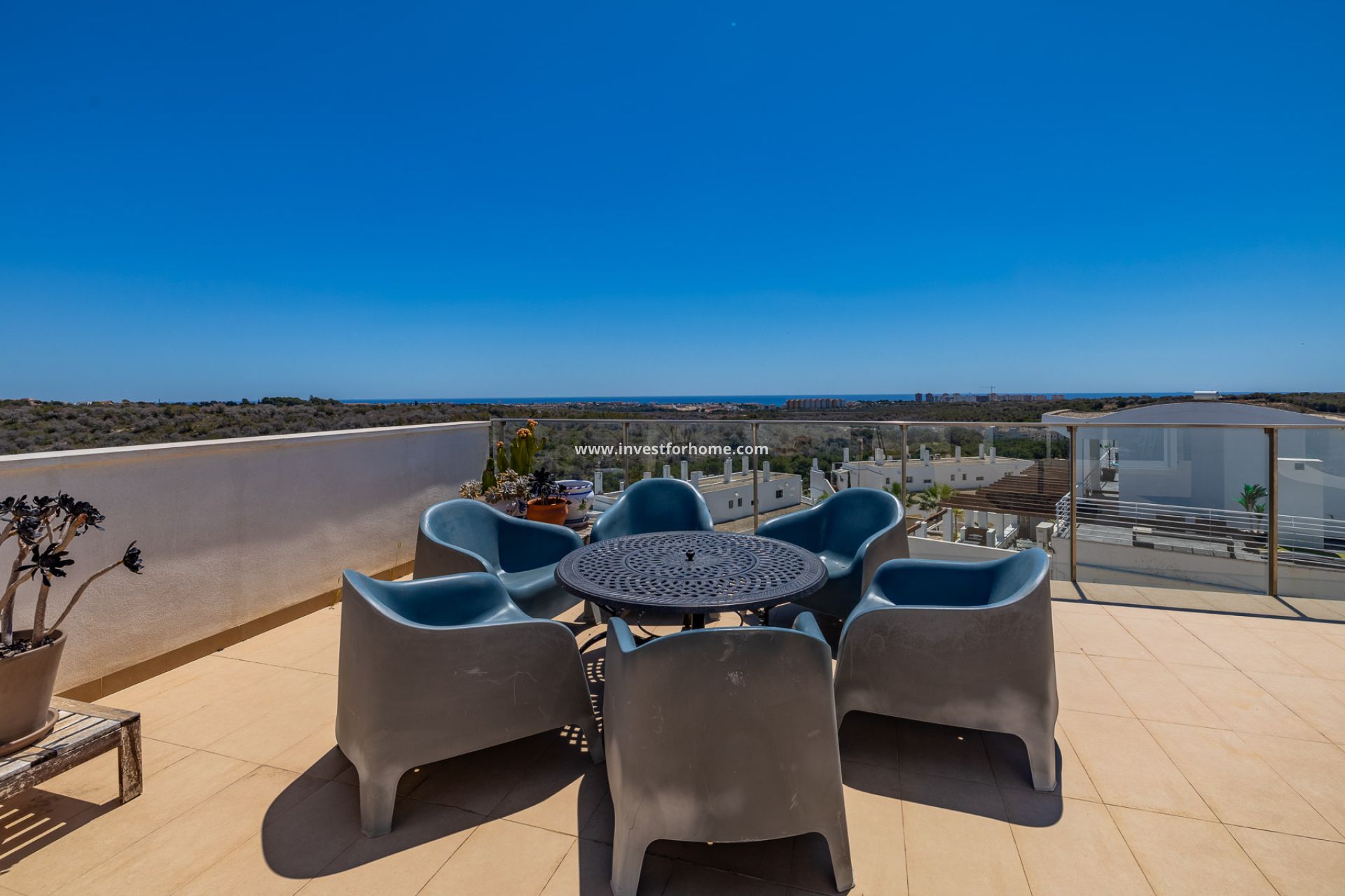 3-Bedroom Penthouse with Sea Views – Las Ramblas Golf, Orihuela Costa. Fantastic penthouse in excellent condition with stunning views of the sea and the golf course. It features two terraces and a spectacular 80 m² private solarium — perfect for enjoying the sun, peace, and open views. Located in a highly sought-after residential area with 2 communal pools and parking. Key features: 90 m² built 3 bedrooms and 2 bathrooms Open-plan kitchen with breakfast bar Air conditioning 2 terraces Private solarium (80 m²) Southeast orientation 2 Communal pools Parking Fully furnished Year built: 2013