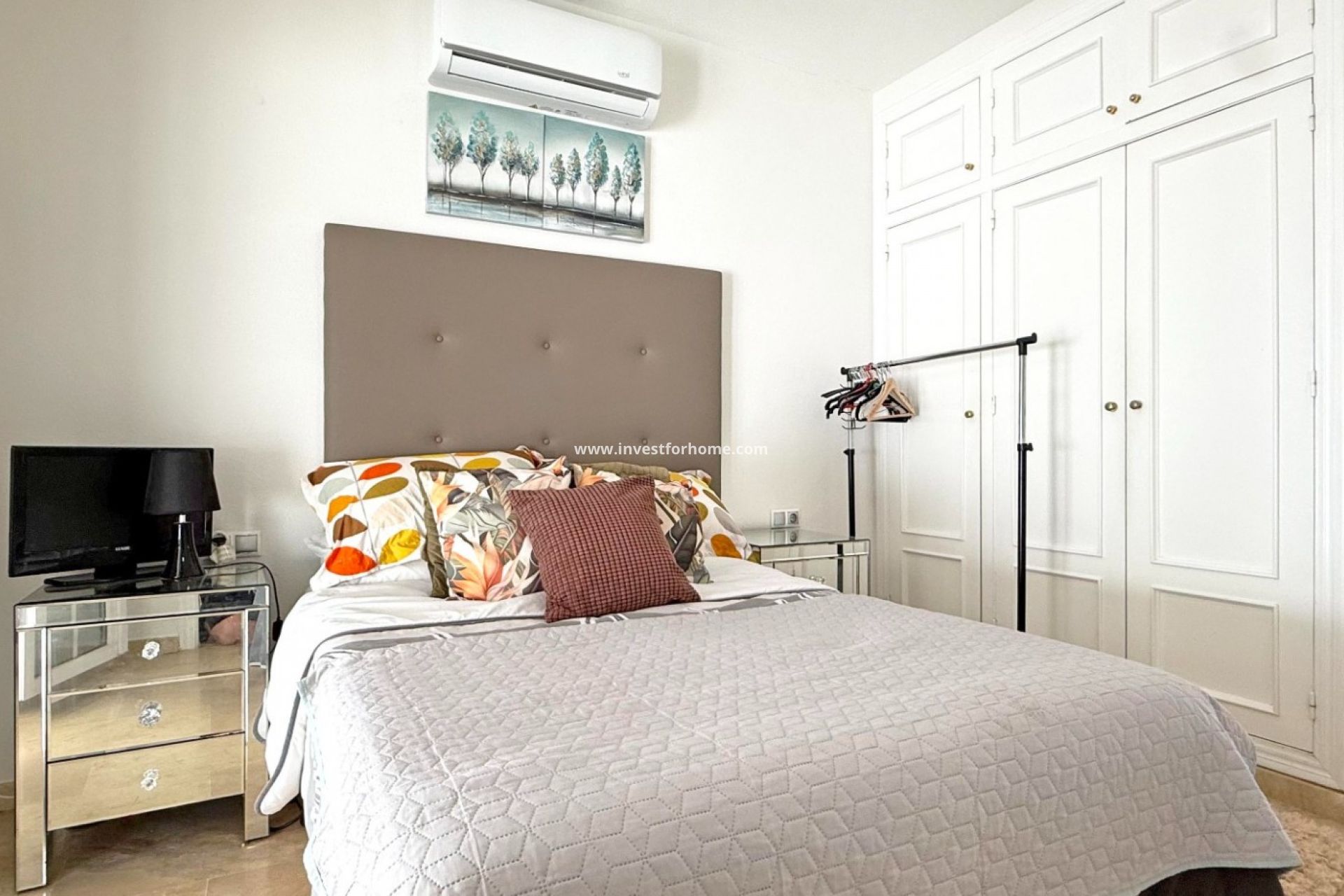 This beautifully maintained villa has been thoughtfully reformed into a 2/3-bedroom home, offering the perfect blend of comfort and style. The property features a private pool, three bathrooms (two of which are en-suite), a spacious kitchen-diner, and a large lounge with direct access to a balcony that overlooks the pool. The balcony can be enclosed with glass curtains, making it ideal for year-round enjoyment. The guest bedroom opens onto a private patio, also fitted with glass curtains, while the master bedroom boasts a generous solarium with stunning sea views. Additional highlights include air conditioning throughout, optional central heating, two large storage rooms, and an excellent location in a quiet and private area of Villamartin. All this just a short walk from the famous Villamartin Plaza and the golf course.