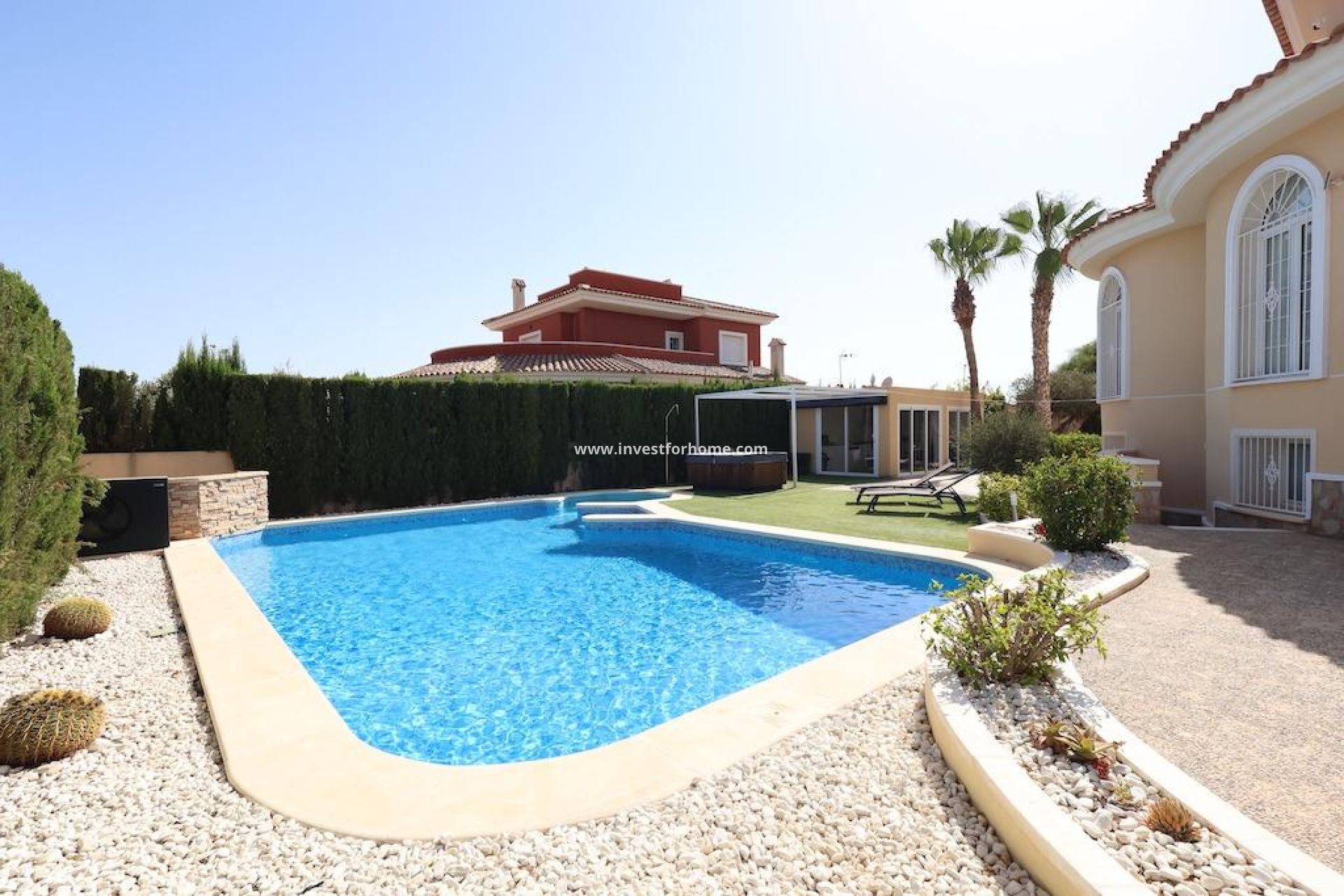 Ciudad Quesada Detached villa model Lucia Especial with a plot of 700 m2 in front of a park with a house on two floors plus basement with an area of 355 m2, with 5 bedrooms and 4 bathrooms, the house is structured in a basement with 145 m2 and has a Turkish bath (Haman), Sauna relaxation area, bathroom, bedroom, cinema area, billiards and table football, the ground floor has 145 m2 and has 2 bedrooms, bathroom, kitchen and large living room with fireplace, the upper floor with 65 m2 has 2 bedrooms, 2 bathrooms, 2 terraces with views of the sea and the lagoons, the house is sold furnished and has a large heated swimming pool, Jacuzzi and barbecue area with outdoor kitchen, also, driveway with pergola.