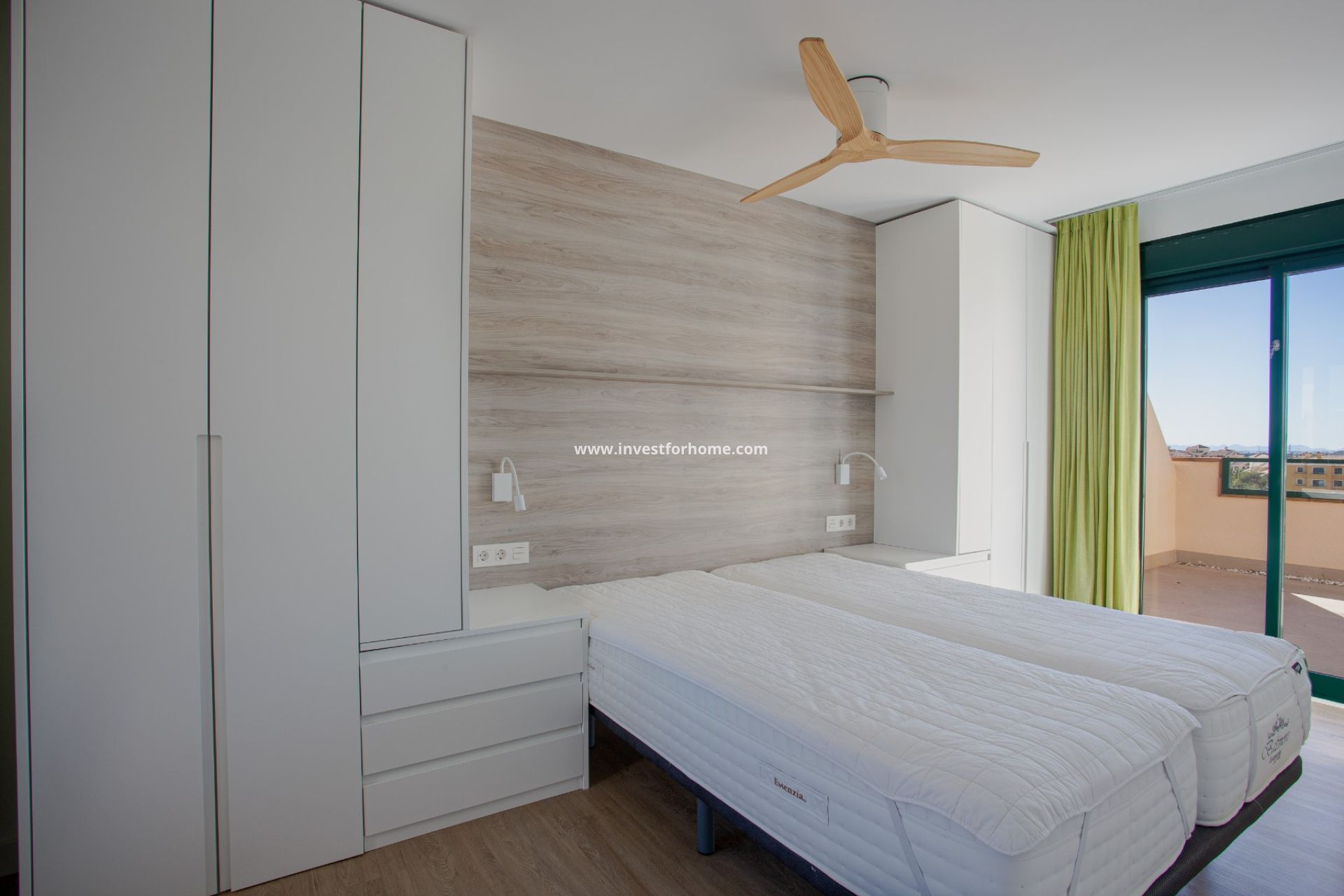 The apartment also includes a large dressing area, new flooring, electric shutters, central heating, and new electrical installation.