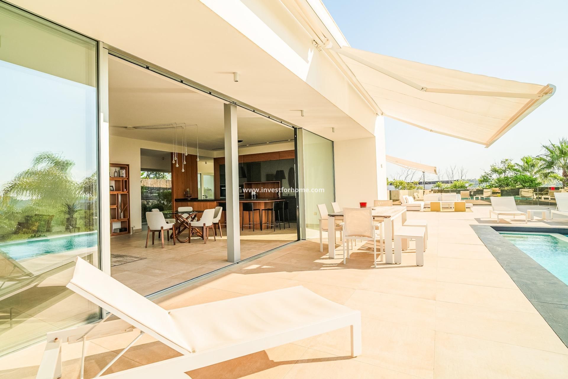 One of the most special properties on the Las Colinas Resort, this villa enjoys absolutely beautiful views of the course, lake and the sea on the horizon. The property has an infinity pool and large terrace which is accessible from the living room and three of the bedrooms. There is a large space downstairs which is currently used as an additional living room with a semi-partitioned bedroom area. There is also a bathroom on the lower level. You have space for parking on the plot and there would be the possibility of repurposing a part of the lower floor for a garage. As well as the views what sets this property apart is its design with a timeless modern style that gives the property a flourish that many other villas do not possess, even in the same price class. The two tone kitchen, designer blinds, beautiful entrance hall, dark tiling around the pool and tinted glass panels on the terraces elevate the villa above the ordinary while not jarring with the surrounds or compromising on practicality. Privacy is another concern many have when buying a property of this calibre and again, the villa delivers. Due to its placement at the end of a cul-de-sac, tinted terrace panelling and aspect you can enjoy your golf panorama but the rare passer-by will only catch glimpses of your facade.