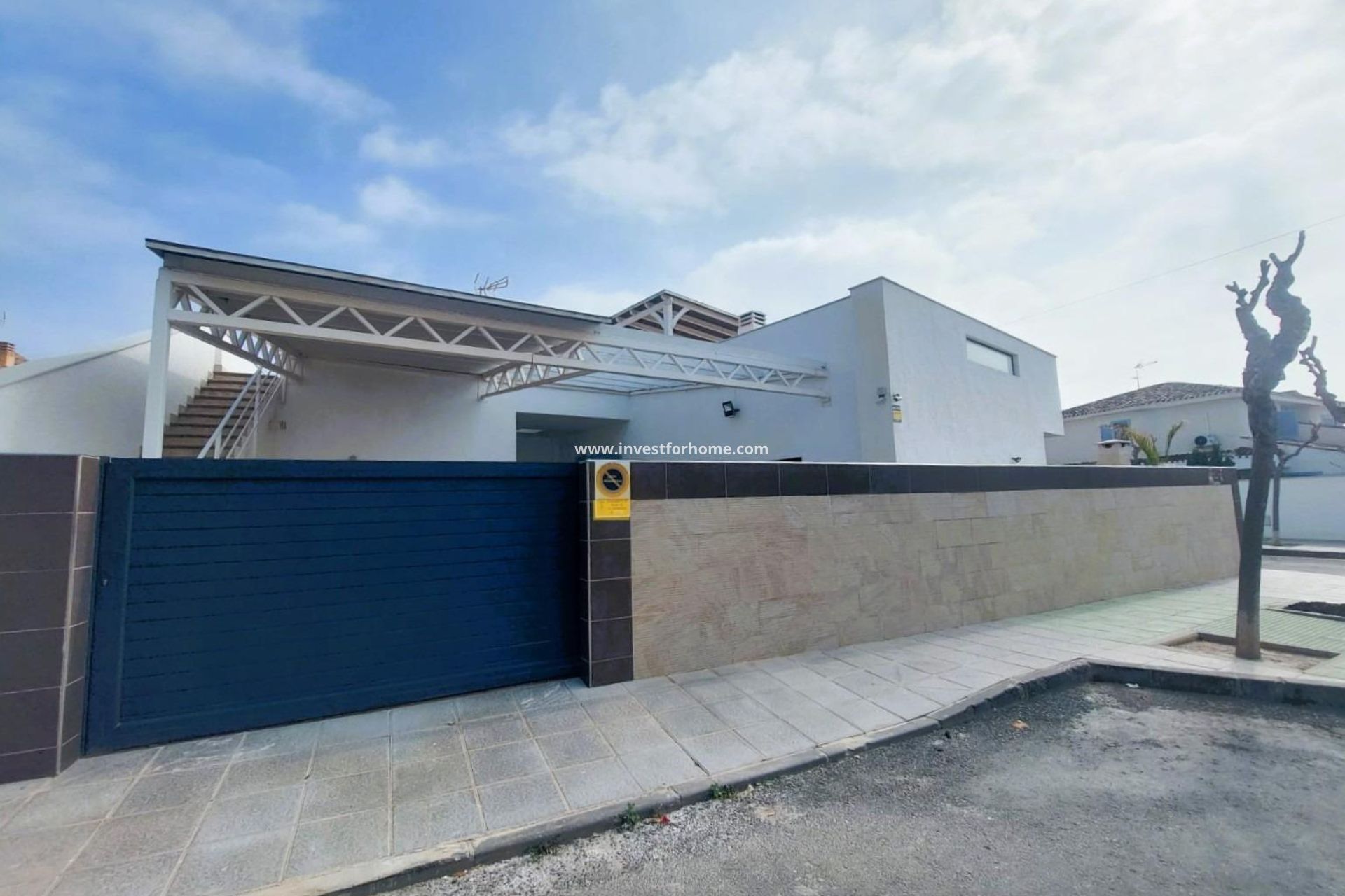 RENT TO BUY AVAILABLE (Contact for more information).. . Fantastic villa on one level, only 400m from the sea in Torre de la Horadada. It has a wonderful courtyard, with parking space (ford with automatic gate), private heated pool with saline water, barbecue area, laundry area and a separate annex, ideal as an office, gym or guest room. . . The villa has a very comfortable layout, with spacious rooms, high ceilings and large windows. From the main entrance we access the hall and from there, a lovely living room. The independent kitchen is very spacious, with an island, dining area and plenty of storage space. Both, the kitchen and the living room have access to the garden.. . The entrance hall also gives access to two spacious bedrooms with fitted wardrobes and a full bathroom, also very spacious. The third bedroom, which is the master bedroom, has a dressing room and a large en-suite bathroom. This bedroom has glass doors with access to the patio and beautiful views of the swimming pool. . . The swimming pool, which is the focal point of the garden/patio, is heated and has salt water.. . To top it all off, this villa has a sun terrace, with sea views, of no less than 170m2! . . It has ducted heating/air conditioning and a beautiful glazed fireplace visible from the living room and kitchen. . . Sold furnished and with white goods. All practically new and of high quality. . . Finally, this fantastic property has access to a private road with parking space for residents.. . Located in a central but very quiet street, close to all amenities and within walking distance to the beautiful beaches of Torre de la Horadada.. . Request a viewing as soon as possible!