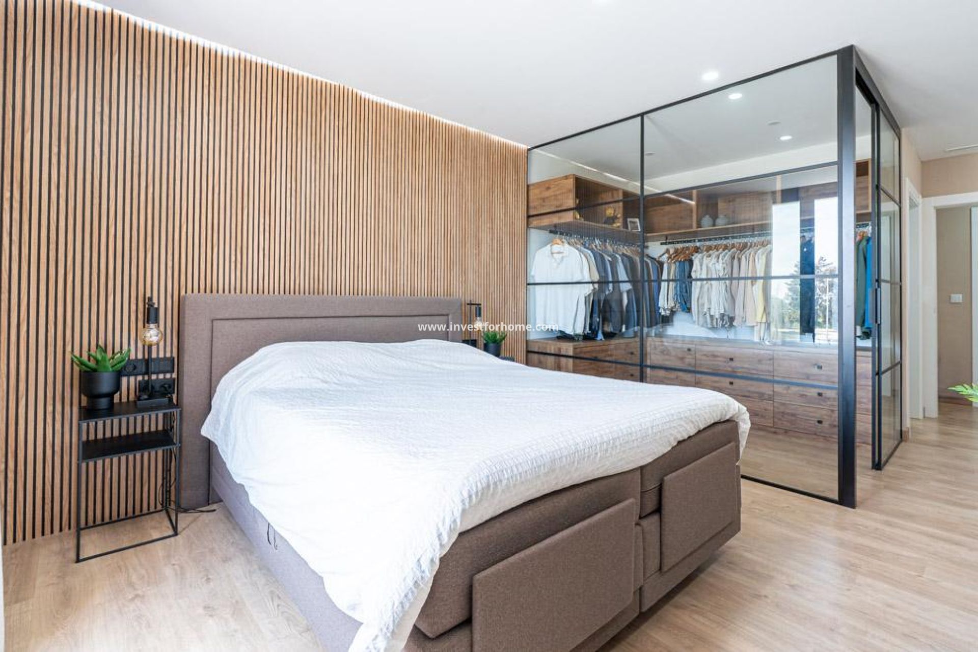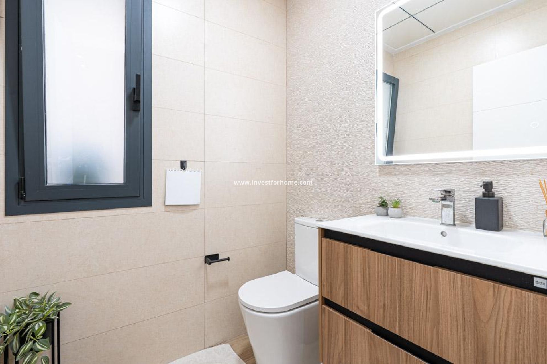 This terraced villa in Dolores is a warm and inviting resale home set within one of the most traditional towns of the Vega Baja. Designed over two floors and a solarium, it combines contemporary architecture with natural textures, creating a calm Mediterranean atmosphere from the moment you arrive. The outdoor spaces include a terrace and pool area located directly off the living room, creating a seamless indoor–outdoor connection, while a rear patio linked to the kitchen offers an additional corner for relaxed outdoor dining.The interior embraces a soft, welcoming style with a natural stone feature wall that mirrors the exterior finishes, complemented by wood-effect details that add warmth and character. The open-plan living, dining and kitchen area extends naturally towards the terrace and pool, making it ideal for everyday living as well as social gatherings. The master bedroom includes a walk-in wardrobe and an en-suite bathroom, while the remaining bedrooms and an additional bathroom are arranged to provide comfort and privacy. There is also a guest toilet on the main floor. The home is sold unfurnished, offering an opportunity to personalise the spaces, although the outdoor furniture is already included. Parking within the plot adds everyday convenience.Dolores is known for its friendly atmosphere, local traditions and complete range of services. It offers supermarkets, cafés, restaurants, sports facilities, parks and a weekly market that preserves the essence of a classic Spanish town. The surrounding countryside is ideal for cycling and leisurely walks, while the beaches of Guardamar del Segura are around 20 minutes away by car. Alicante Airport is approximately 30 minutes’ drive, and Murcia International Airport about 50 minutes, ensuring excellent connectivity for residents and visitors.
