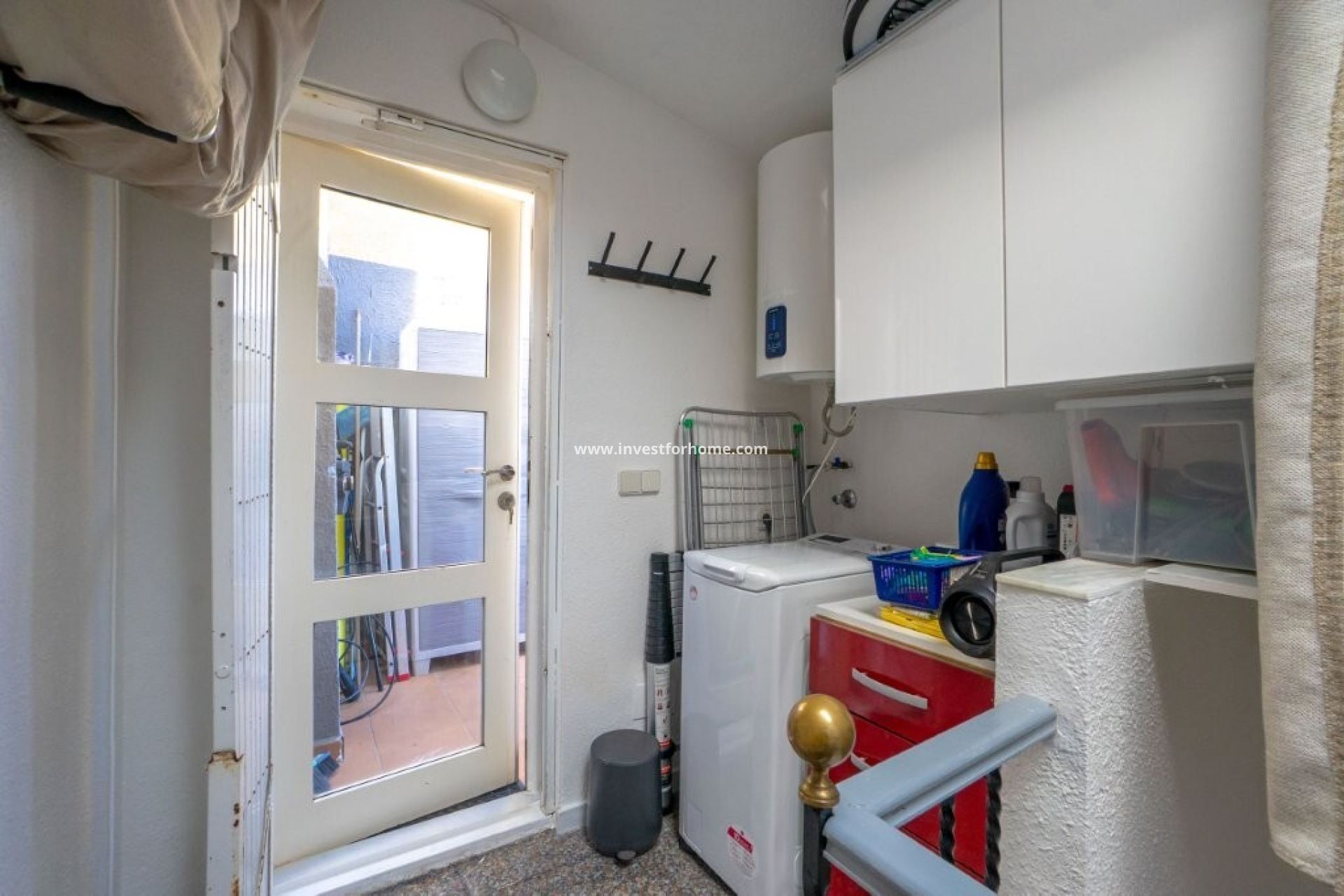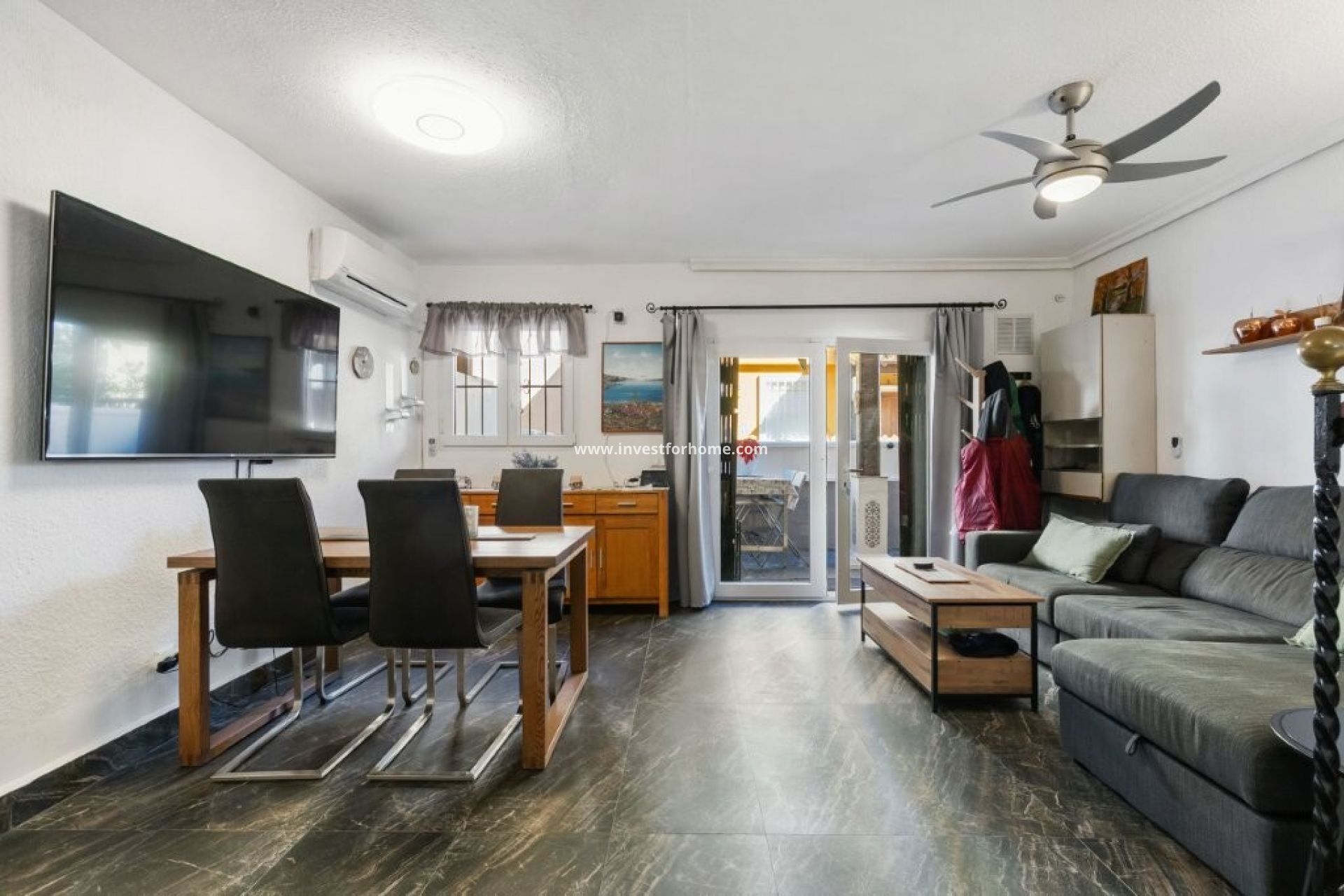 Beautifully renovated townhouse with roof terrace and sea views. 120 meters from the sea at Cabo CerveraThis beautiful renovated townhouse is 70 m2.On the first floor there is a nice patio before you enter the living room that has an open solution to the dining room and kitchen. The kitchen is modern and has plenty of cabinets.There is also a guest toilet on this floor.On the second floor there are 2 bedrooms with wardrobes and air conditioning as well as a beautiful modern bathroom.At the top there is a practical laundry room/storage room before you go out onto the charming roof terrace with a small barbecue area and nice views.The home is sold furnished, with white goods and air conditioning.The home appears very good, so you can move straight in without doing anything.Asking price: 195,000 euros + costs.Facts:Area: 70 m22 bedrooms1 bathroom1 toiletAir conditioningAppliancesFurnishedRoof terraceTiled gardenSea viewYear of construction: 1988Energy certificate: EProperty tax: 150 euros per yearCommunity expenses: 100 euros per year.