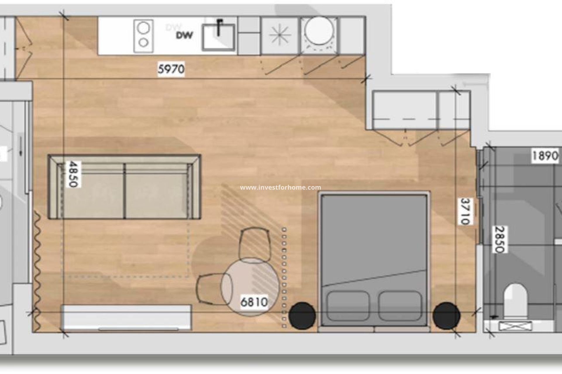 Stylish 1-bedroom apartment of 45 m² in the heart of Torrevieja, just 250 meters from Los Locos Beach. The apartment offers a bright living area with panoramic floor-to-ceiling windows, a fully equipped modern kitchen, and a comfortable bedroom with built-in wardrobe and elegant finishes. The bathroom features a rainfall shower, stone washbasin, and underfloor heating. Climate control, LED lighting, and a private terrace complete this sophisticated Mediterranean retreat—ideal as a holiday home or a permanent residence under the Spanish sun.