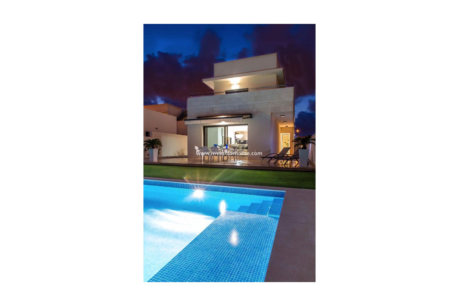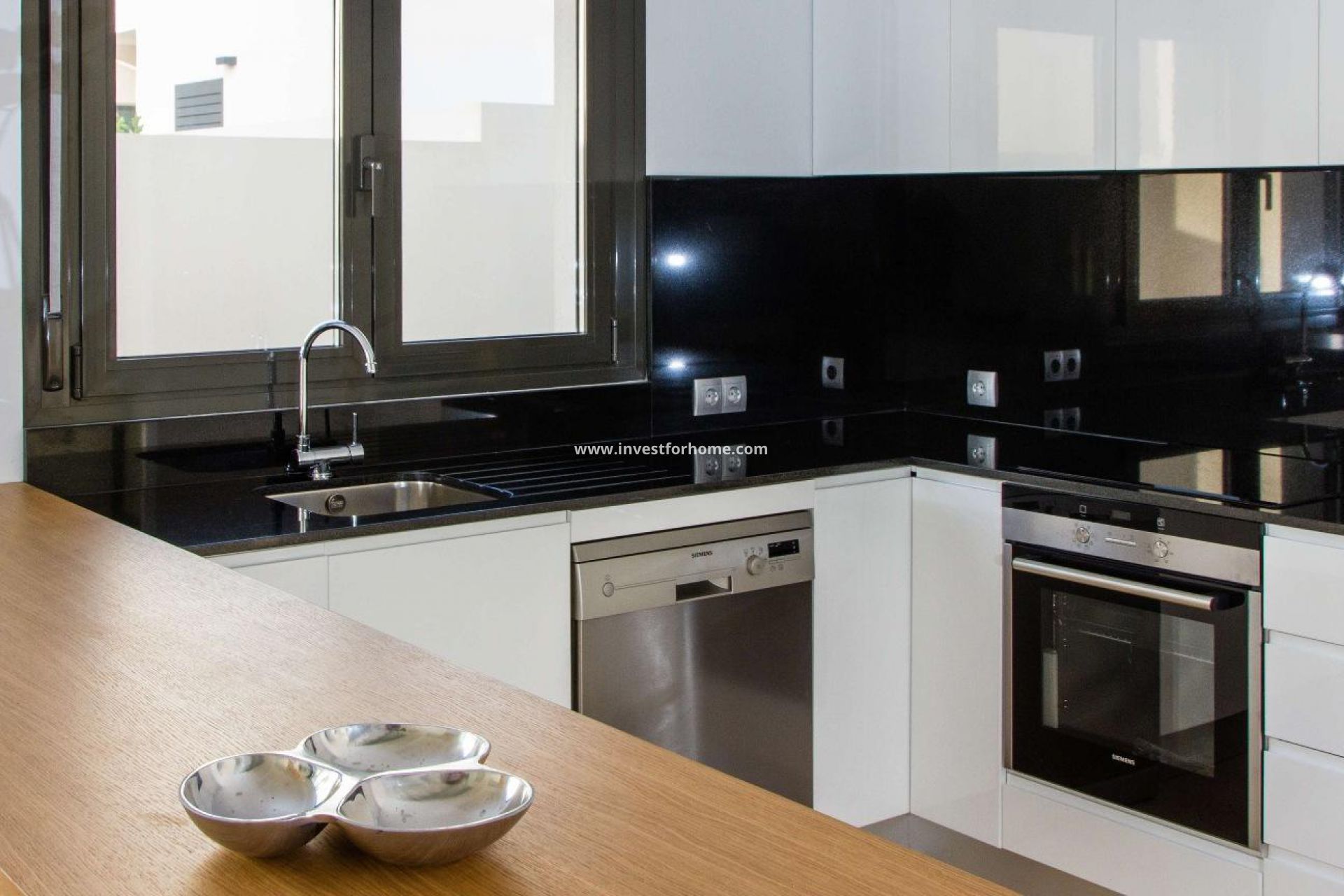 Luxury villas located at the end of Los Dolses (Villamartin), are ready to move into! Modern villas with 3 or 4 bedrooms, 2 or 3 bathrooms, large living rooms with open kitchen, terraces of 54m2 to 68 m2 and roof terraces of 35m2 to 49m2. Plots vary from 365m2 to 482m2. Parking on own fenced plot. There is a private pool. The prices include pre-installation of air conditioning in every room, alarm and under floor heating in the bathrooms.