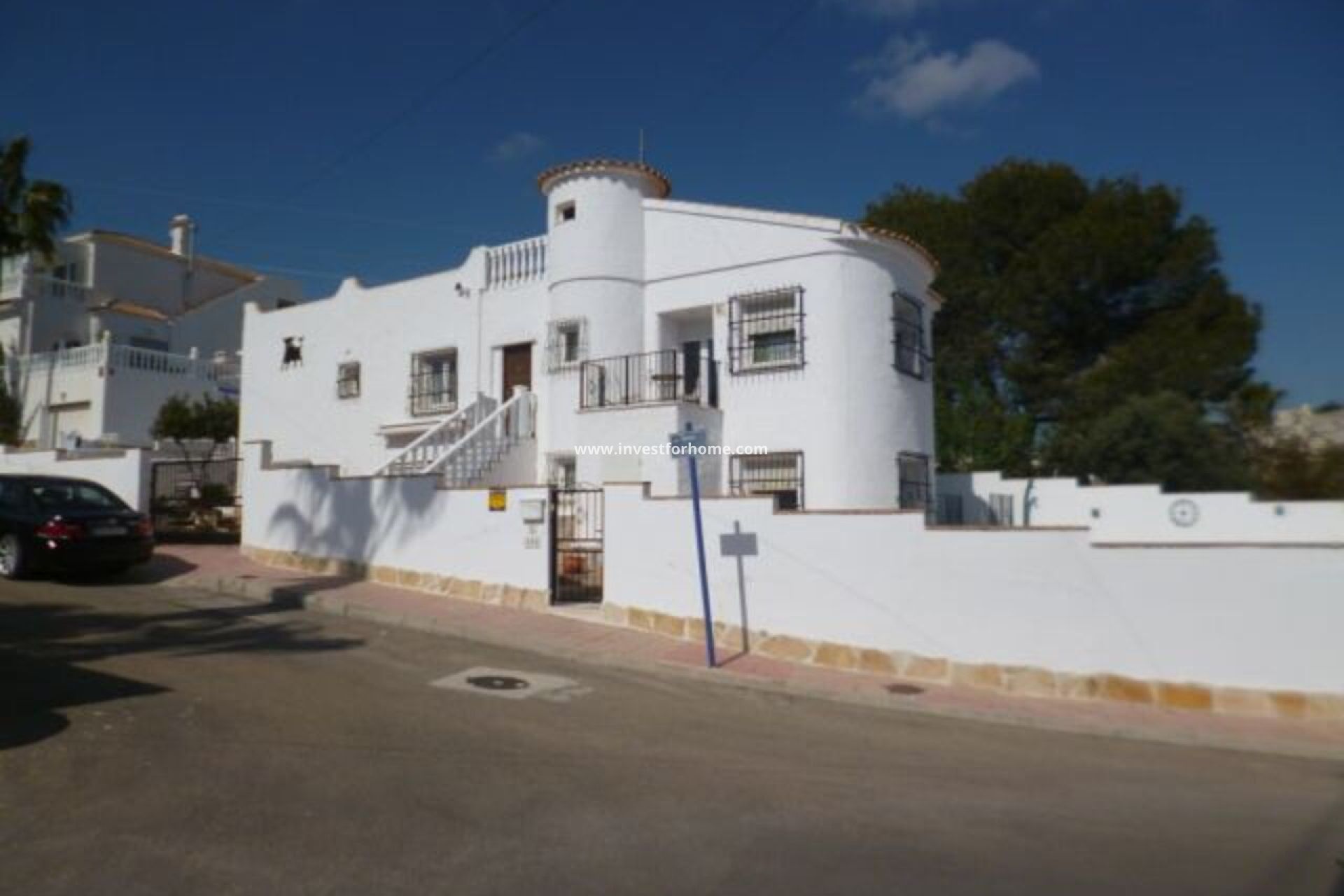 A Very spacious 5 bedroom Villa, beautifully decorated throughout and well maintained gardens with a private swimming pool. Situated in blue lagoon close to shops and bars and schools, south east facing with large solarium with fantastic sea views. The property consists of two separate apartments, the top floor has a fantastic large master bedroom with en-suite and walk in ward robe, living room with small bar open plan to a modern American kitchen and dining room. The bathroom has a shower and two more bedroom one with a exit to rear garden. Stairs to the solarium a massive terrace to a glazed store room for sun loungers etc. The Ground floor apartment also has a large lounge living room open plan to the modern open plan kitchen, a corridor from the living room to a storage / games room. Bedroom with en-suite and exit door to the front, another bathroom with shower and another bedroom with fitted wardrobe . The garden is low maintenance and has a private swimming pool and off street parking. A great investment, perfect for holidays or permanent living. Villamartin is a very popular holiday resort for especially for golfers. There are three excellent golf courses that are close to each other in the Villamartin area although Villa Martin Golf Course is by far the most established and best known of the three (the other two are Las Ramblas and Campoamor). Villa Martin is a fine championship course and is noted for hosting the 1994 Mediterranean Open. The golf course provides some stunning scenery and is of medium difficulty with excellent quality greens. The Campoamor and Las Ramblas golf courses are close by and are just a few minutes drive away.The renowned Villa Martin Plaza has a great selection of bars, shops and restaurants and is the ideal spot for that "special night out". This beautiful central square has a bank, supermarket, shops, cafes and some excellent restaurants. The gardens are very picturesque, look closely and you will notice the naked lady golfer statue. Close to Villamartin are numerous uncrowded beaches with magnificent views over the sparkling blue Mediterranean and the "white sand" that are typical of the Costa Blanca. The beaches along the coastline close to Villamartin are Playa Flamenca, La Zenia, Cabo Roig, and Campoamor. All of these beaches and all the other major beaches along this part of the Mediterranean coastline are regularly awarded the European Blue Flag which is your guarantee of high standards and facilities for the whole family. Villa Martin is situated about 8 kilometres south of the bustling town of Torrevieja on the southern Costa Blanca and is just a short drive from the motorway (AP-7).