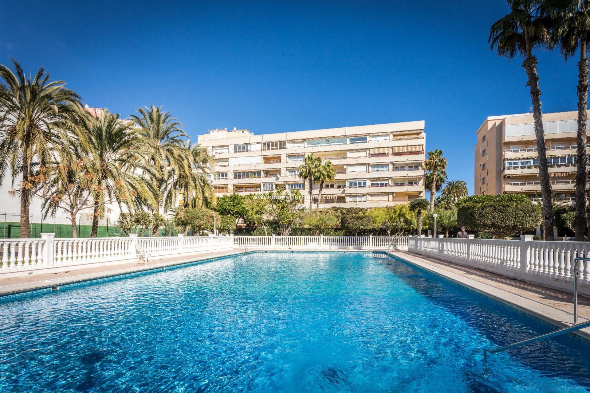 This gated residence is located in front of the beach,with a large communal garden of 15,000 m2 with 500 palm trees, swimming pools, tennis courts and playgrounds and a restaurant-bar, all of use exclusive for the owners. One of the most sought after residences in Torrevieja.