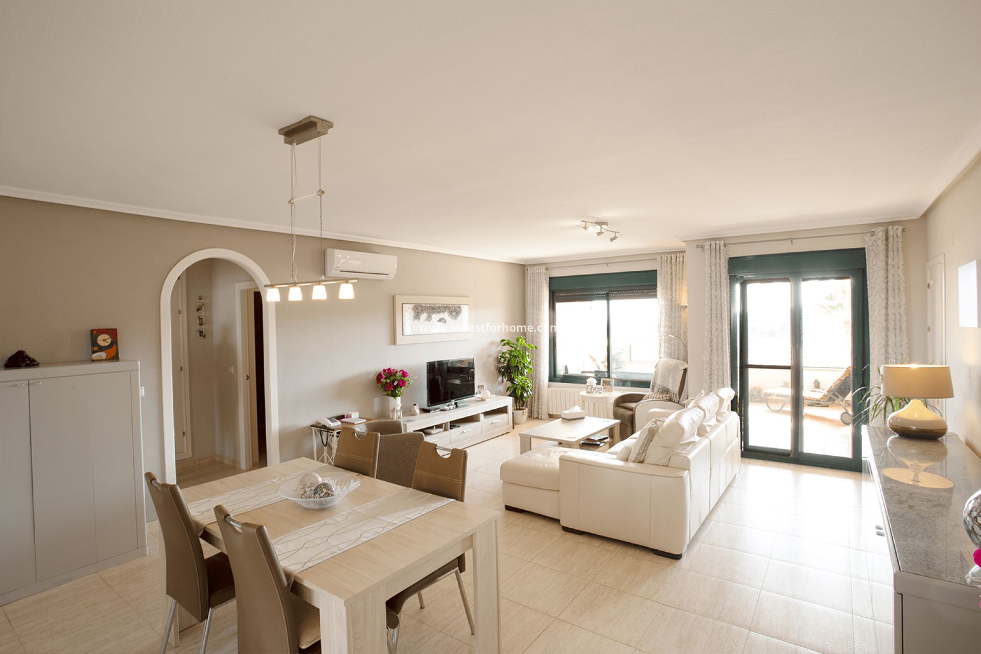 This lovely apartment is located in the prestigious area of Lomas de Campoamor next to the golf course with private security throughout the year.This apartment set on the first floor consists of 2 bedrooms with large fitted wardrobes, 2 bathrooms with white lacquered furniture and marble countertop, fully fitted modern kitchen equipped with appliances, serving hatch and separate utility room. A spacious living room with air conditioning and gas heating radiators.From the living room you have direct access to a large southwest facing terrasse. In the residence there is a community pool and within a 5 minute walk the commercial center of La Fuente where you will find all kinds of services such as restaurants, cafes and supermarket.The apartment will be sold fully furnished.