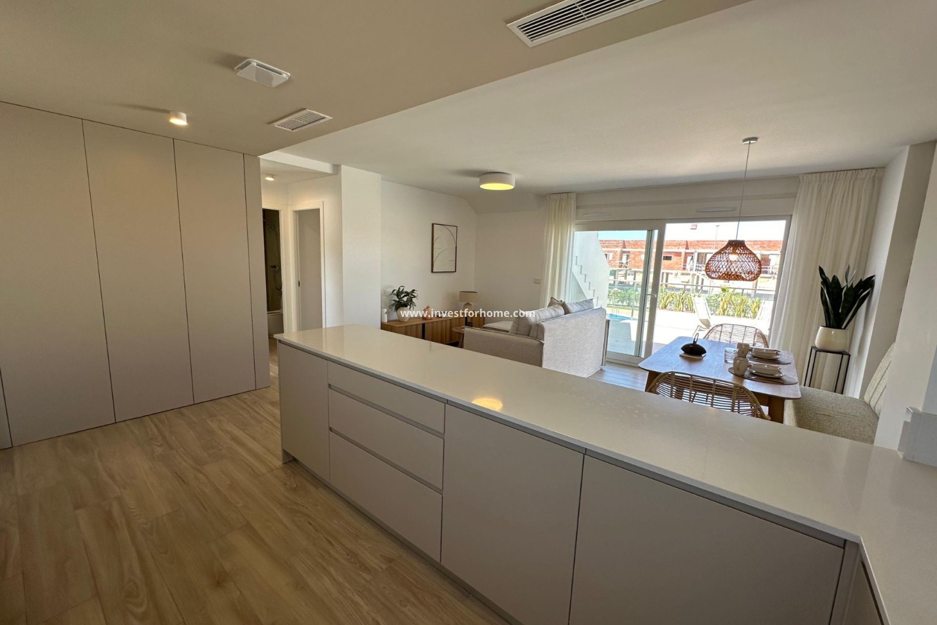 Lovely new built residence with beautiful landscaped gardens,pools and beautiful mountain views.For those who are looking for a holiday home but away from the crowd this is the perfect choice . There are 2 types of bungalows to choose from either ground floor with garden or top floor with solarium.The Price starts from 194900€ for a ground floor 2 bedroom apartment with garden.These spacious apartments located by a golf resort are built with top quality materials .