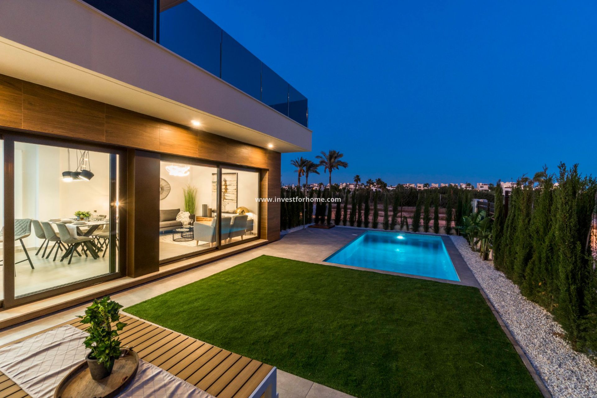 These villas are located in a private complex of detached villas on Roda Golf. The two-storey properties comprise of three double bedrooms (the ground floor bedroom opening onto the garden, the master bedroom having direct access to a private terrace, all with fitted wardrobes), two bathrooms, modern integrated kitchen (with breakfast bar) and open-plan living/dining area with big windows allowing the natural light to flood through and leading to a private garden with swimming pool and off-street parking.