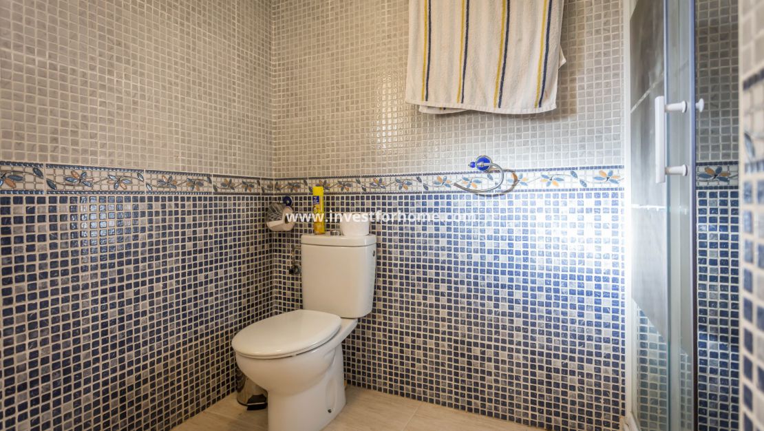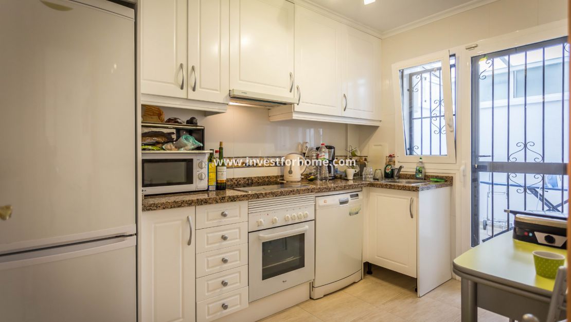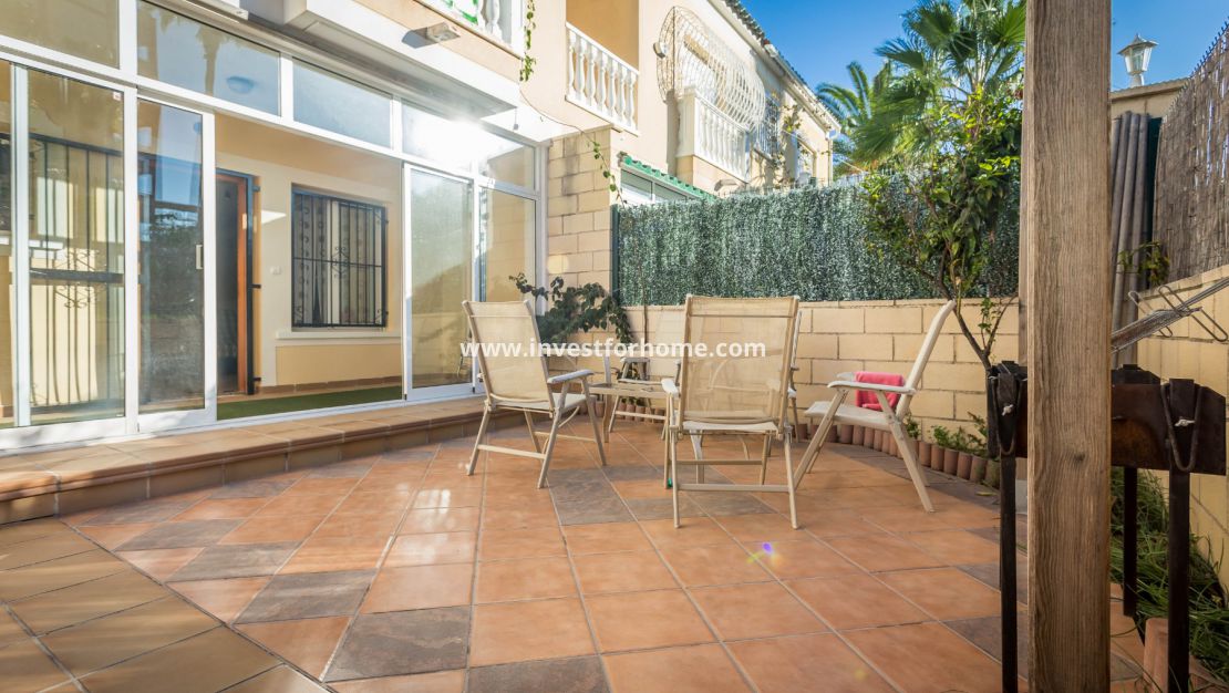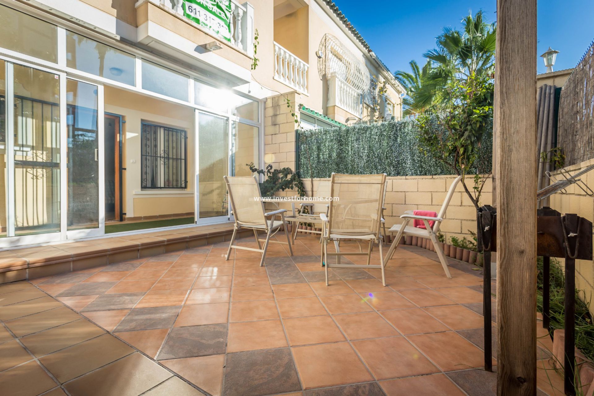 Lovely Townhouse on 3 floors in Aguas nuevas ,it has a front big terrace, living room, kitchen,3 bedroom one on the ground floor ,3 full bathroom , a glassed in back terrace and a big solarium . There is air conditioning in all rooms .The property is situated in a fenced secured residence , has a private parking space , and has a community pool a few steps away from the shopping center , and only 700 meter to the beach of La Mata