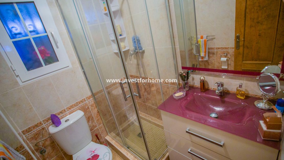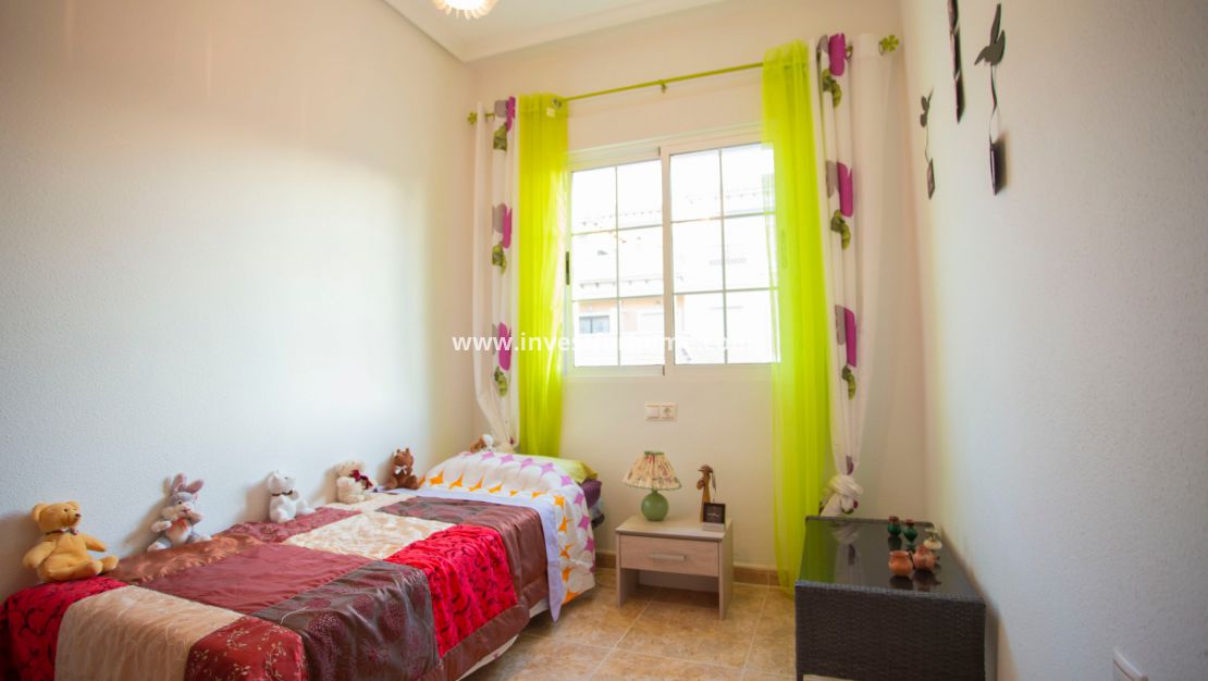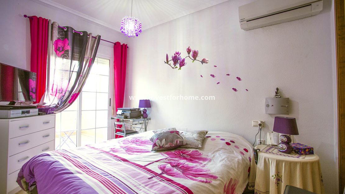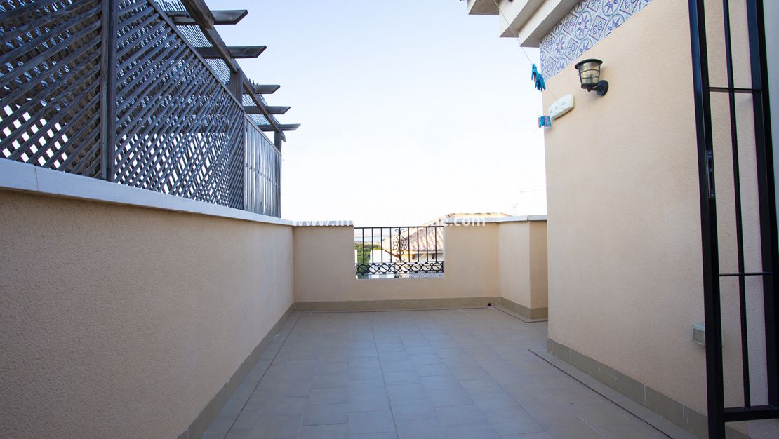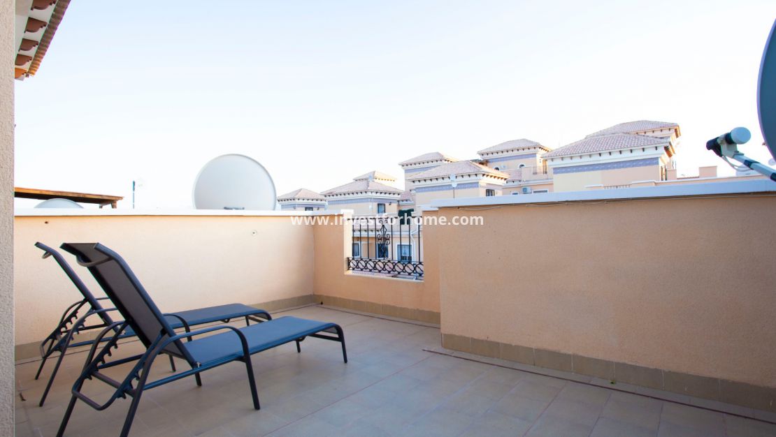 Lovely south east facing townhouse  of 76 m2 plus 26 m2 of  front terrace in a popular residencial area of Orihuela-Costa. On the ground floor a large living room, bathroom and a fully fitted separate kitchen leading to the patio  .On the  first floor 3 bedrooms,family bathroom and small  terrace . Further up there is also a solarium where to enjoy the sun all day .Sold  fully furnished and equipped with all white goods , air conditioning and awnings. Ready to move in.