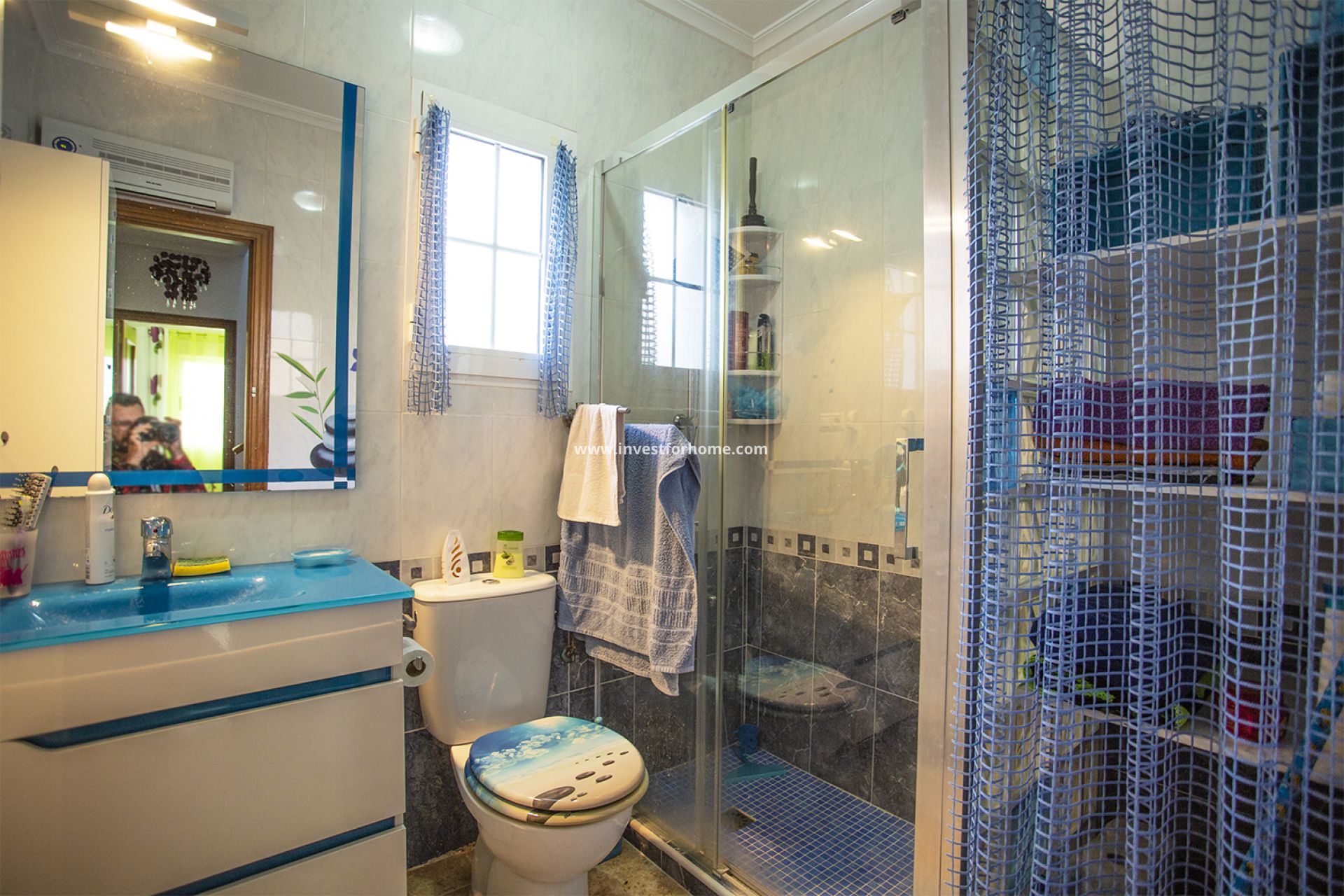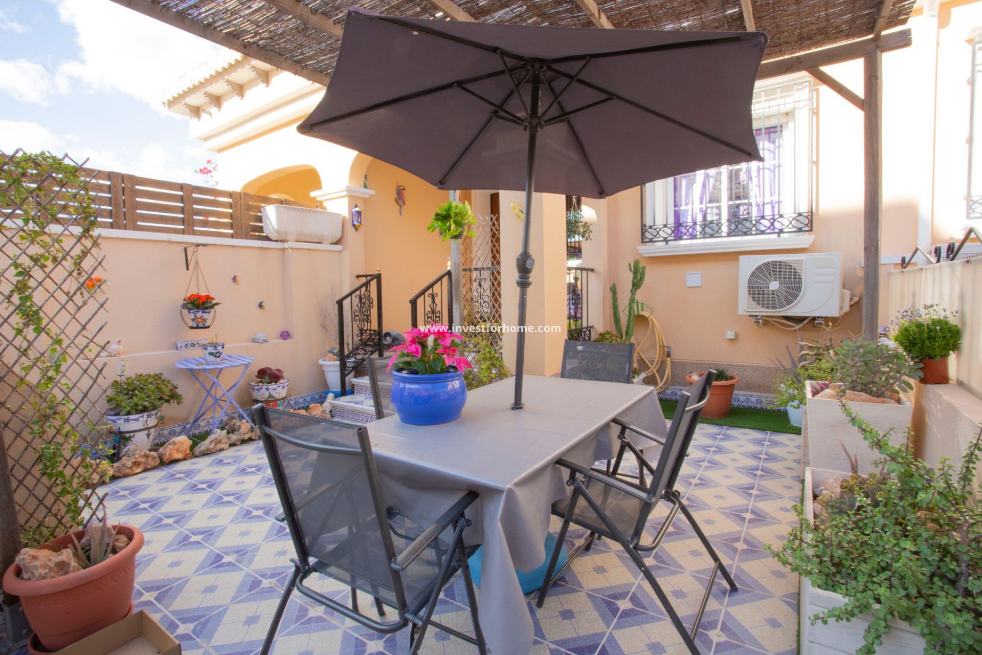 Lovely south east facing townhouse of 76 m2 plus 26 m2 of front terrace in a popular residencial area of Orihuela-Costa. On the ground floor a large living room, bathroom and a fully fitted separate kitchen leading to the patio .On the first floor 3 bedrooms,family bathroom and small terrace . Further up there is also a solarium where to enjoy the sun all day .Sold fully furnished and equipped with all white goods , air conditioning and awnings. Ready to move in.