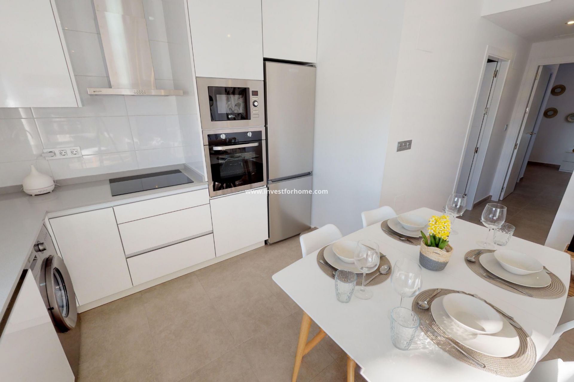 A staircase leads you to the top floor area with large tiled private terrace, with entrance door to the property. Like the ground floor models a generous open plan lounge/ dining area with the oversized kitchen, 2 bedrooms to the rear (master with en-suite). Access is gained to the private roof solarium from the front.