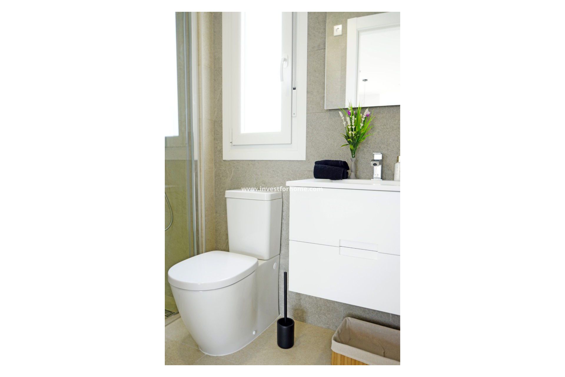 This 3 bedroom villa is located in the area of Los Montesinos, Costa Blanca. The plot is fully enclosed by a wall ensuring privacy. Large sliding gate for car access to the parking space. Hallway leading to the large open-plan main living space, containing lounge, dining and kitchen area with breakfast bar and a range of modern units. Large sliding doors open onto the terrace area at the front of the villa, and a second set open onto the garden at the back of the villa. Master bedroom with built in wardrobes and en-suite shower room, equipped with shower tray, WC and vanity unit. . Bedroom 2 (double) with built in wardrobes. Bedroom 3 (double) with built in wardrobes. Separate bathroom equipped with shower tray, WC and vanity unit. Small internal utility room with space for the washing machine. External steps leading up to the roof terrasse. Furniture and white goods package available as an option.Also possibility to add a private pool of 3x6 for an extra charge of 14500€.