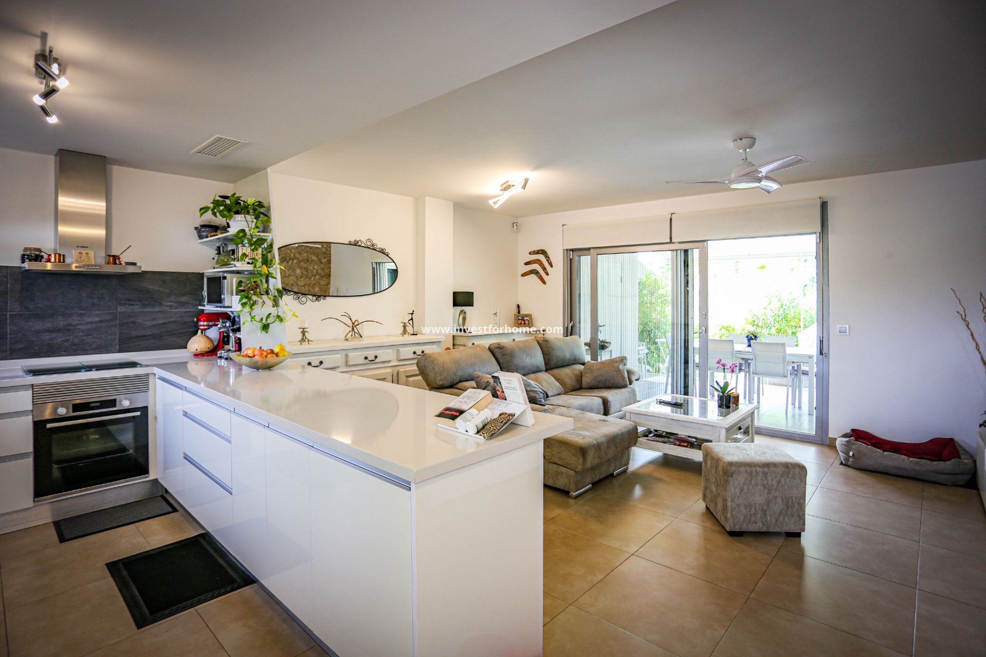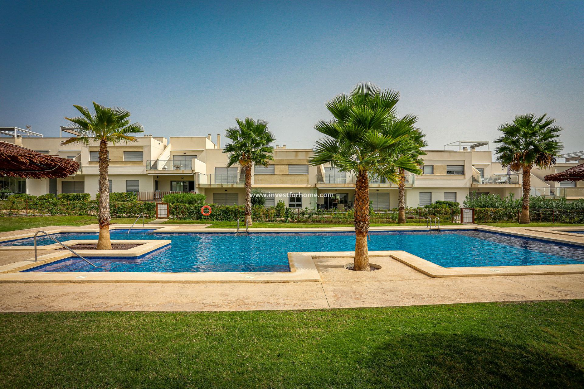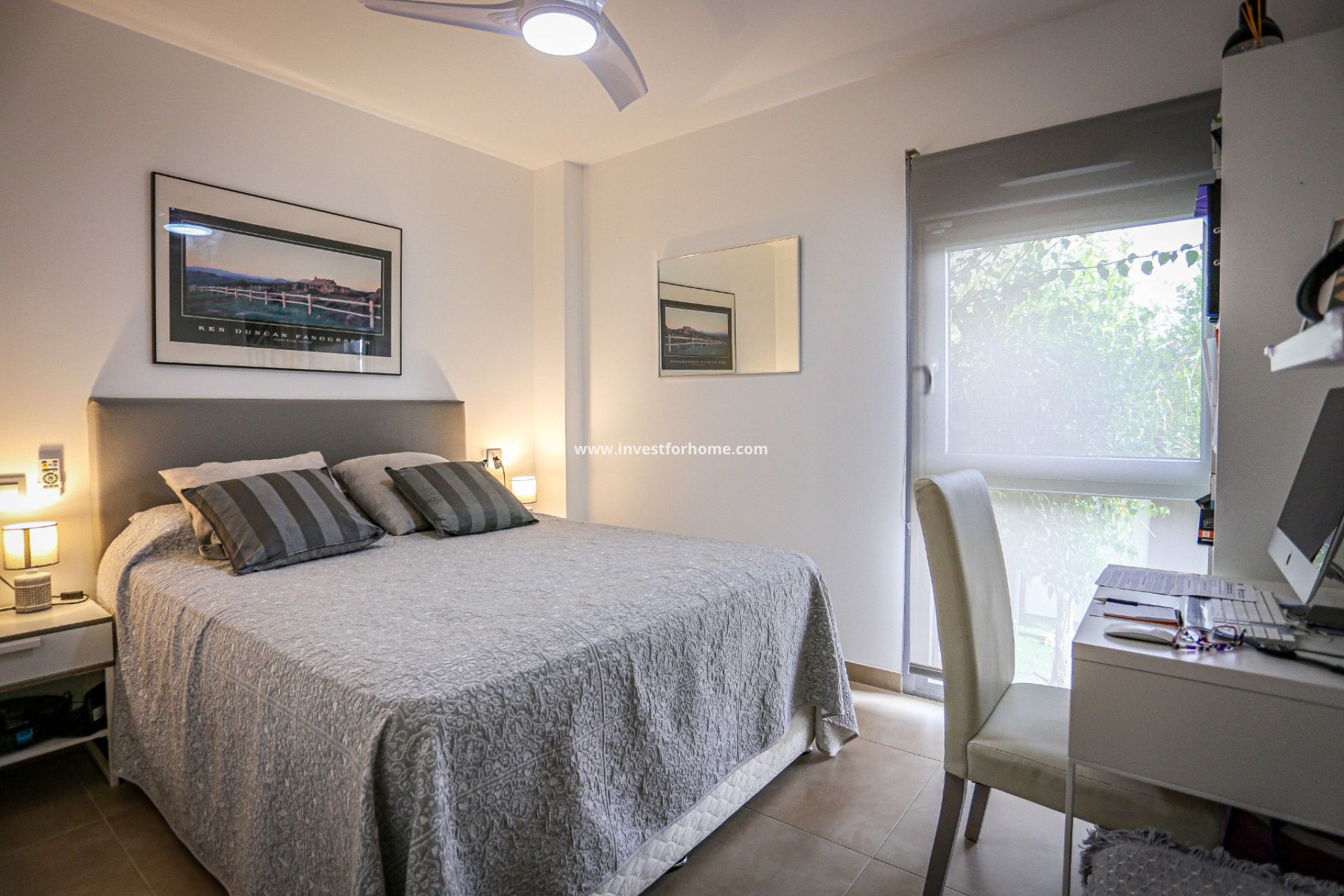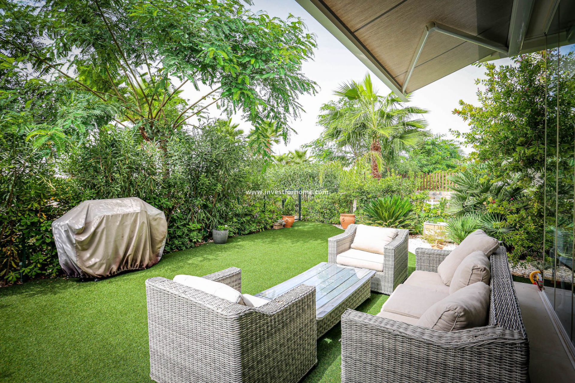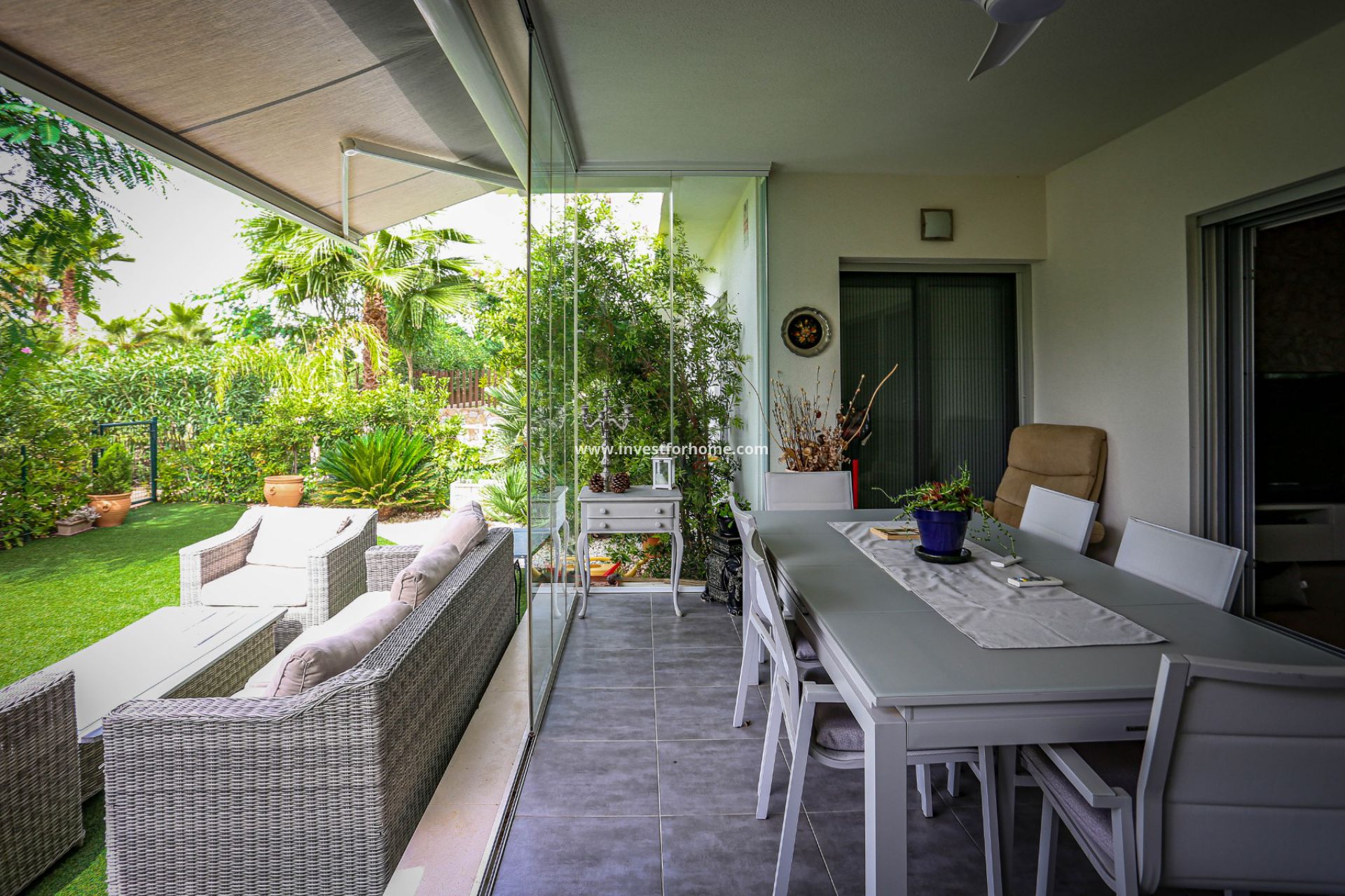 This ground floor house is located on the Vistabella Golf Resort. It consists of 2 bedrooms, 2 bathrooms and a large terrace with a garden of 108m2. It also has a private outdoor parking space. The house built in 2018 is sold completely furnished in addition to many extra amenities: Additional interior and exterior storage space, a pergola, mosquito nets on all windows, centralized reversible air conditioning. It is a private residence with swimming pool and large green area.