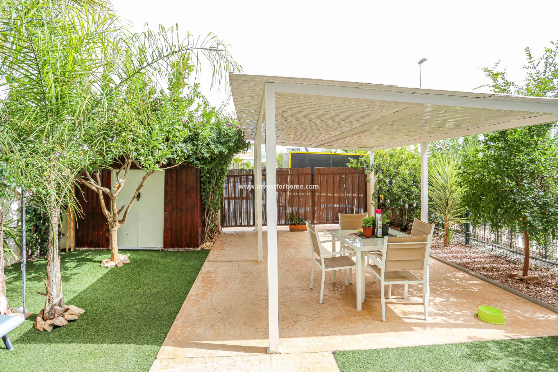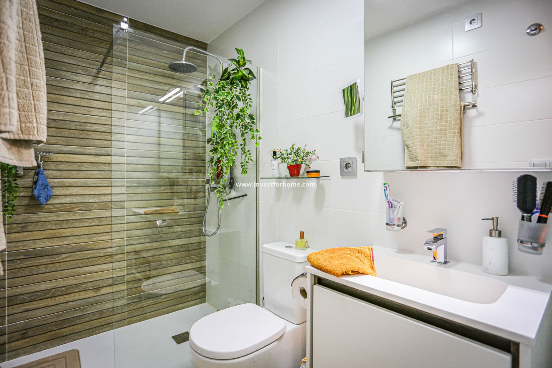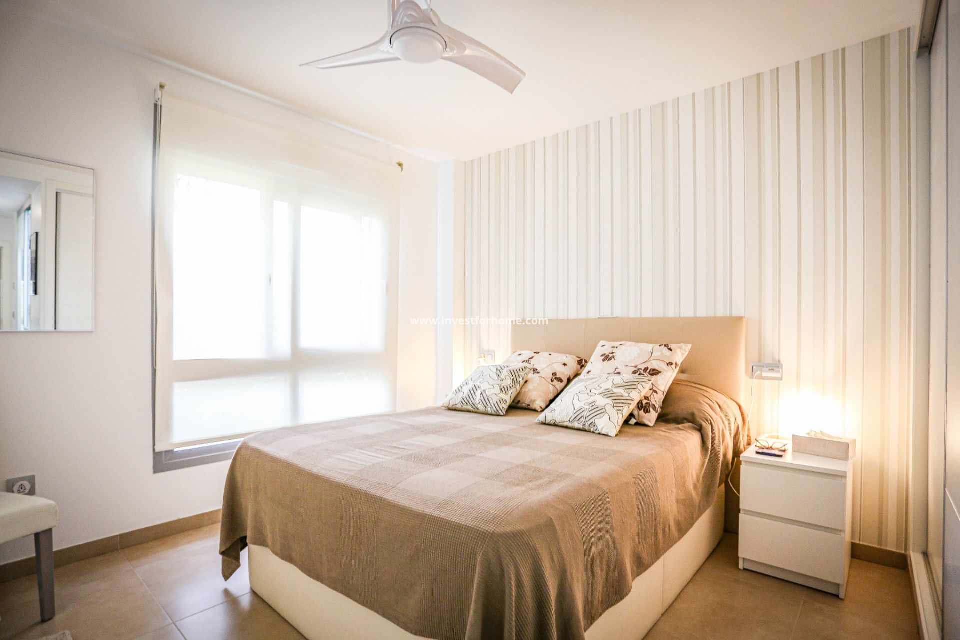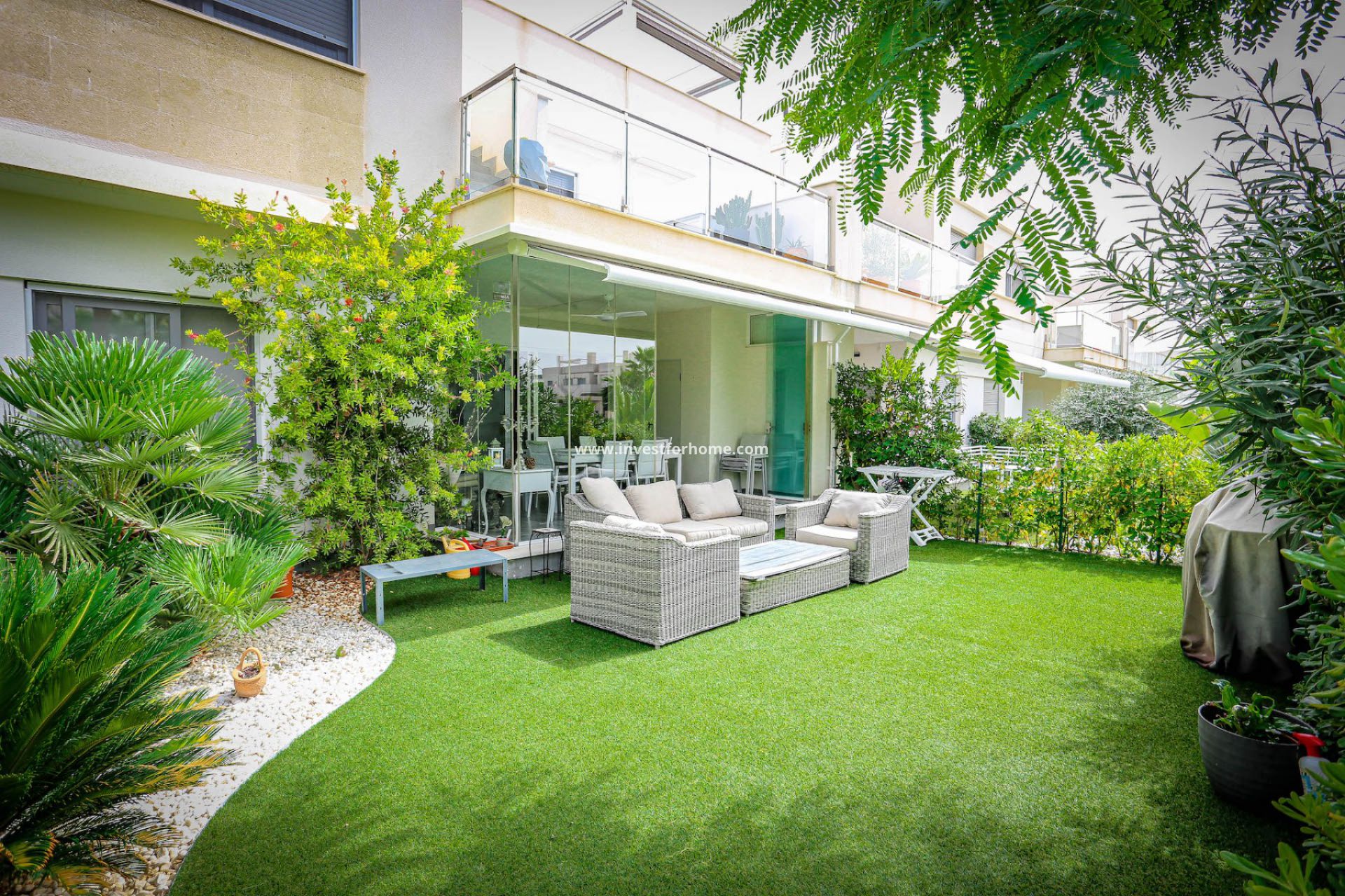 This ground floor house is located on the Vistabella Golf Resort. It consists of 2 bedrooms, 2 bathrooms and a large terrace with a garden of 108m2. It also has a private outdoor parking space. The house built in 2018 is sold completely furnished in addition to many extra amenities: Additional interior and exterior storage space, a pergola, mosquito nets on all windows, centralized reversible air conditioning. It is a private residence with swimming pool and large green area.
