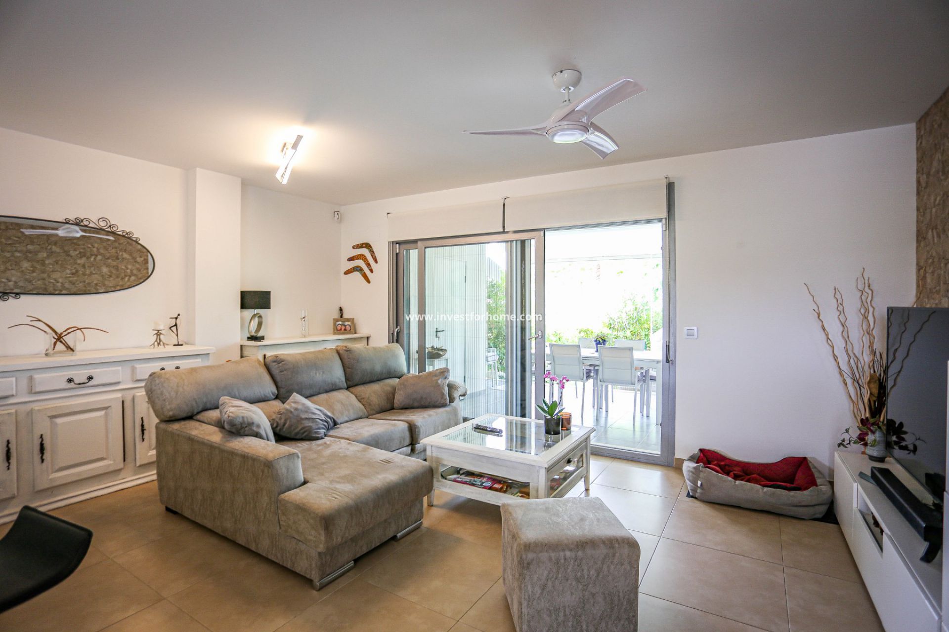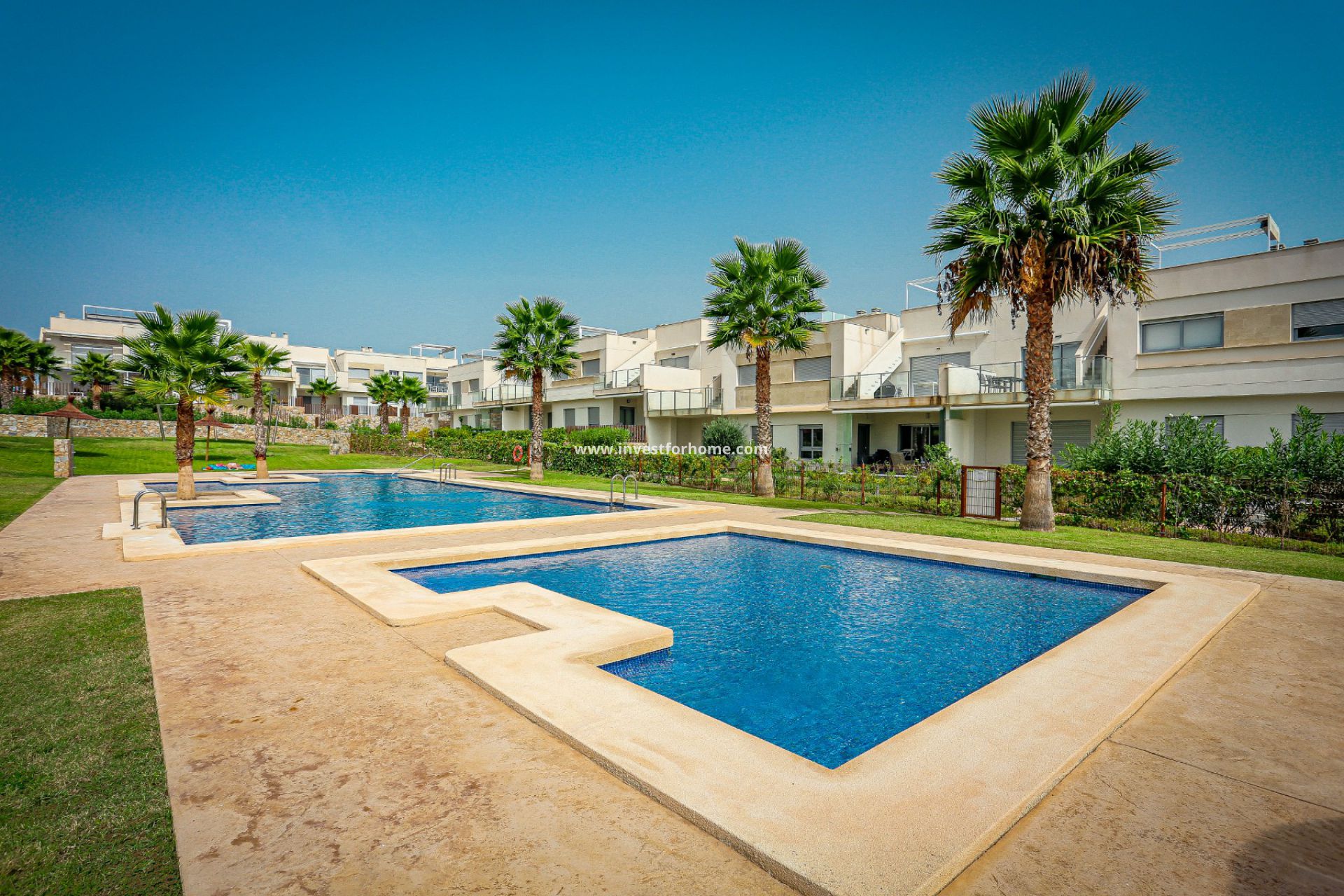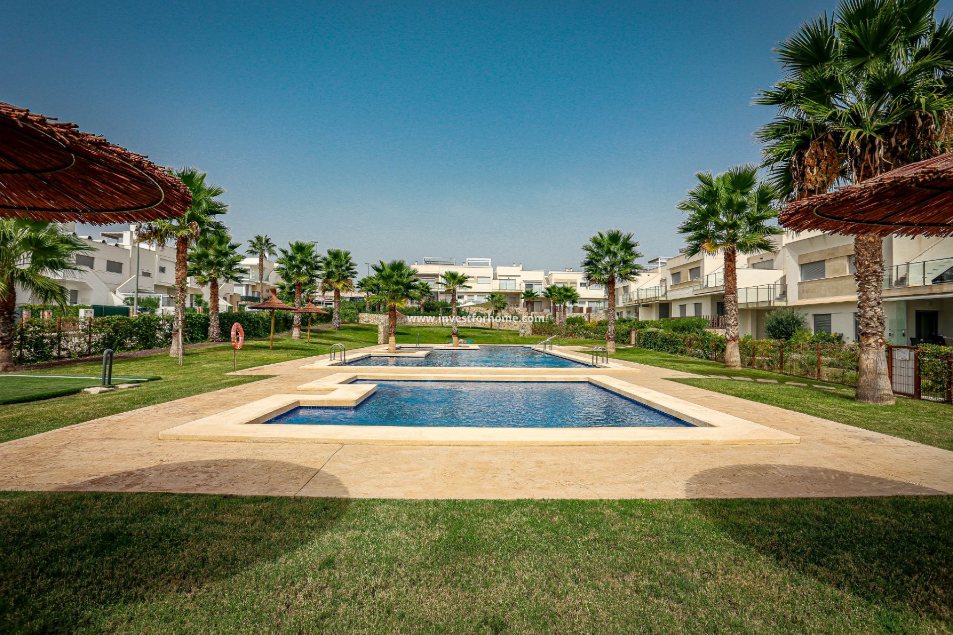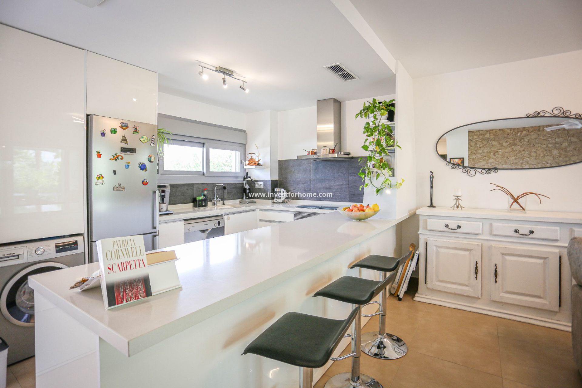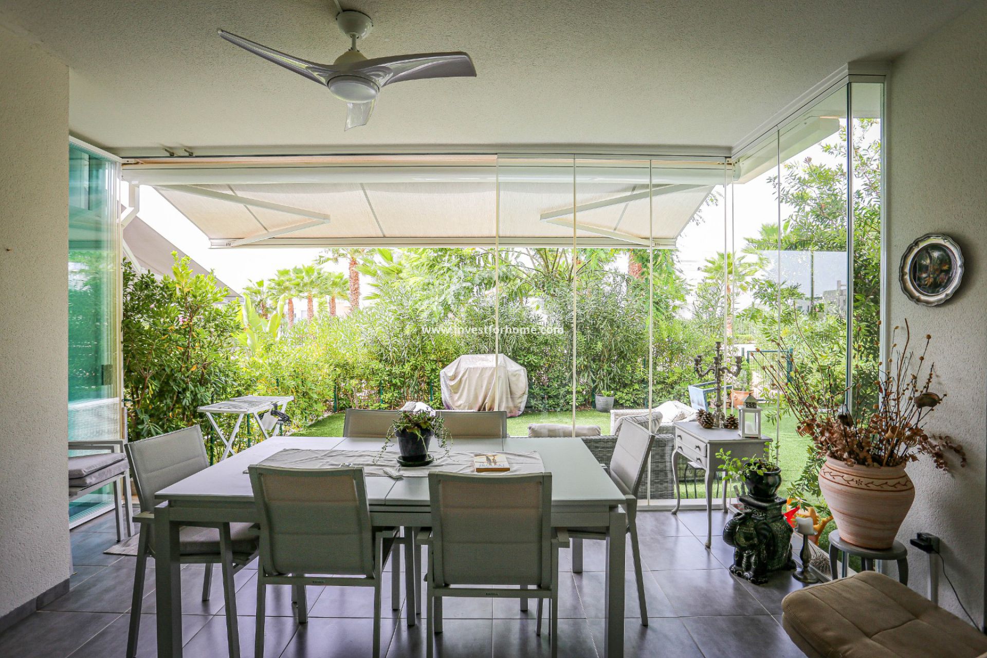 This ground floor house is located on the Vistabella Golf Resort. It consists of 2 bedrooms, 2 bathrooms and a large terrace with a garden of 108m2. It also has a private outdoor parking space. The house built in 2018 is sold completely furnished in addition to many extra amenities: Additional interior and exterior storage space, a pergola, mosquito nets on all windows, centralized reversible air conditioning. It is a private residence with swimming pool and large green area.