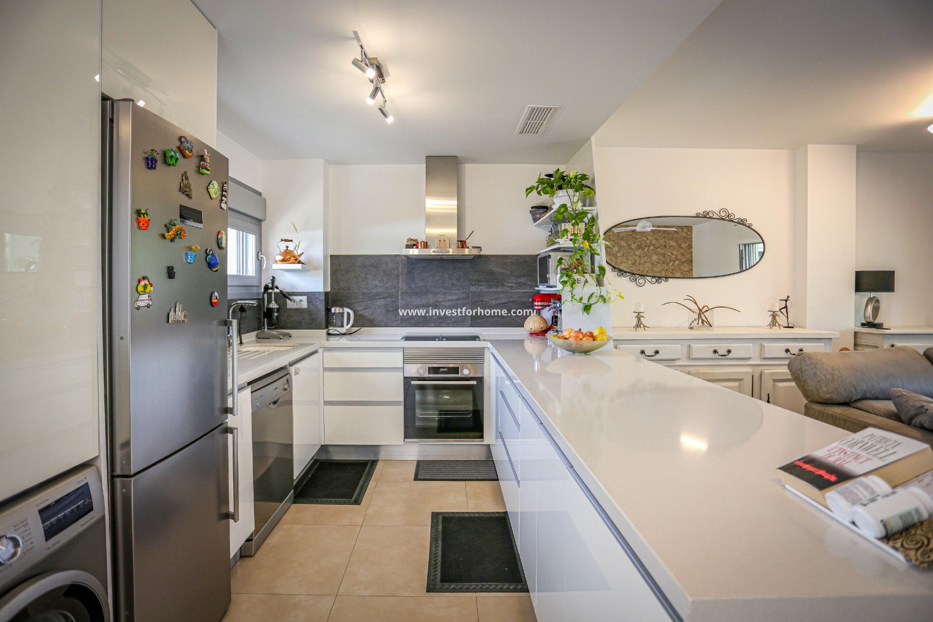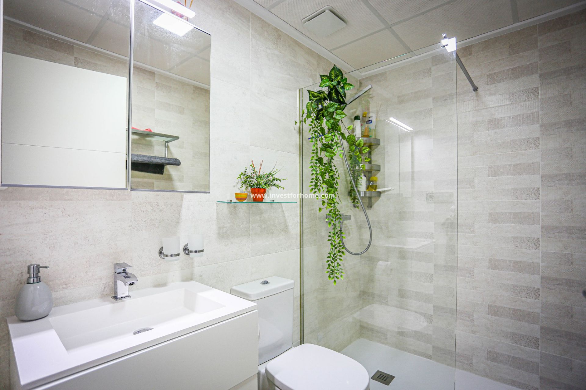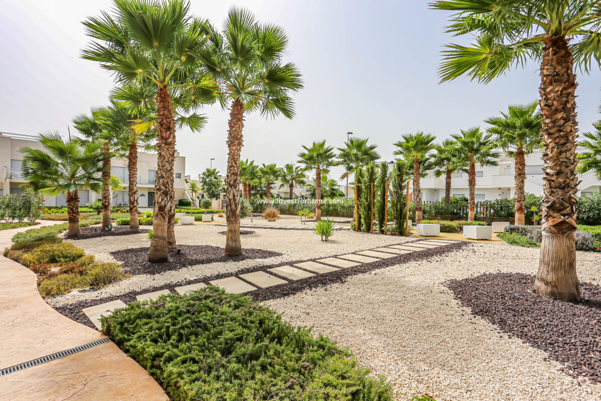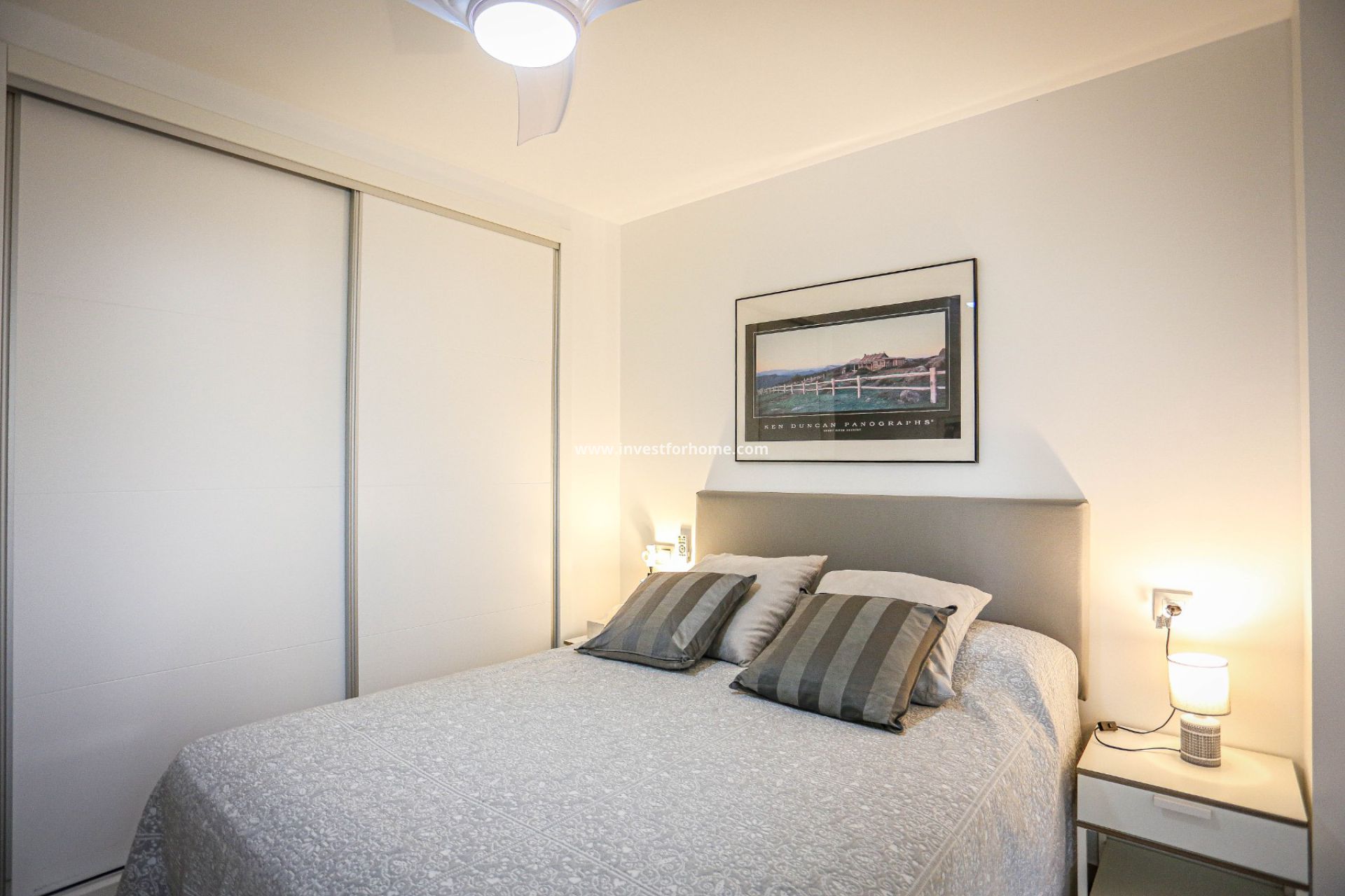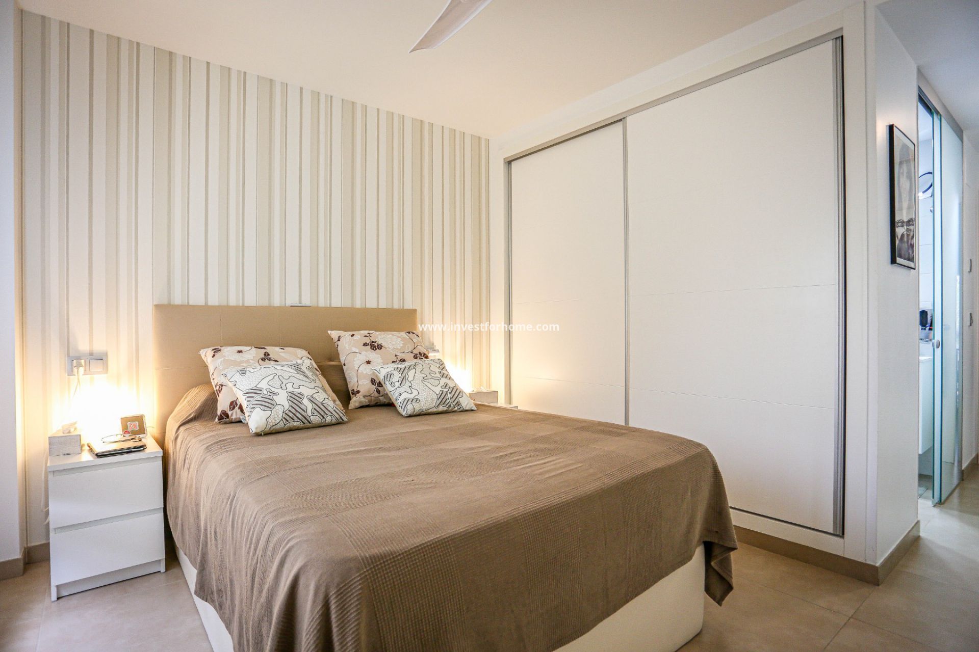 This ground floor house is located on the Vistabella Golf Resort. It consists of 2 bedrooms, 2 bathrooms and a large terrace with a garden of 108m2. It also has a private outdoor parking space. The house built in 2018 is sold completely furnished in addition to many extra amenities: Additional interior and exterior storage space, a pergola, mosquito nets on all windows, centralized reversible air conditioning. It is a private residence with swimming pool and large green area.