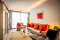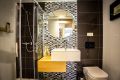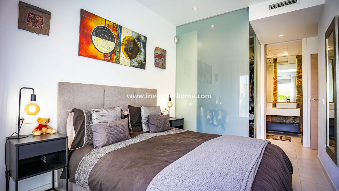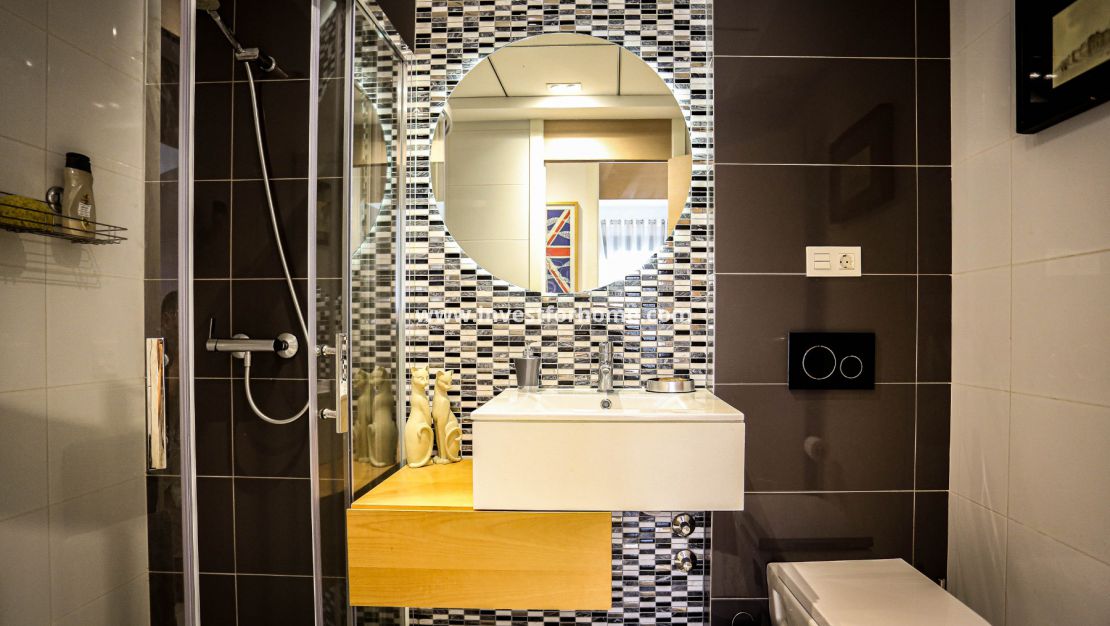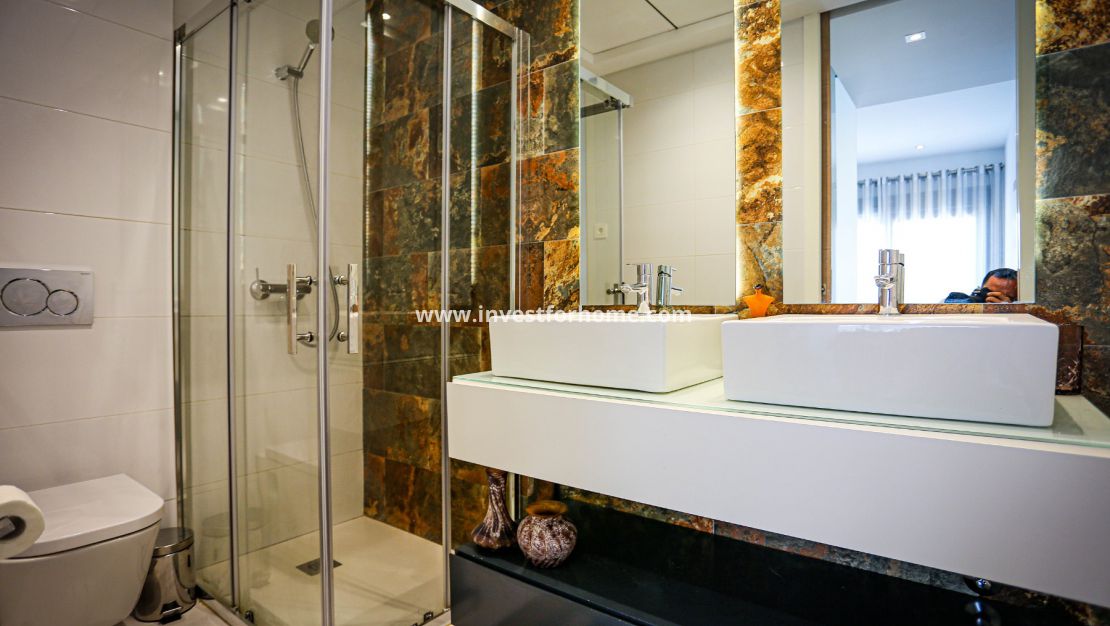 The second bedroom, also very spacious, has direct access to the terrace as well as to the other main room, and with a built-in wardrobe. The second bathroom, also very spacious and very modern, consists of a single vanity unit with a large mirror and a shower.