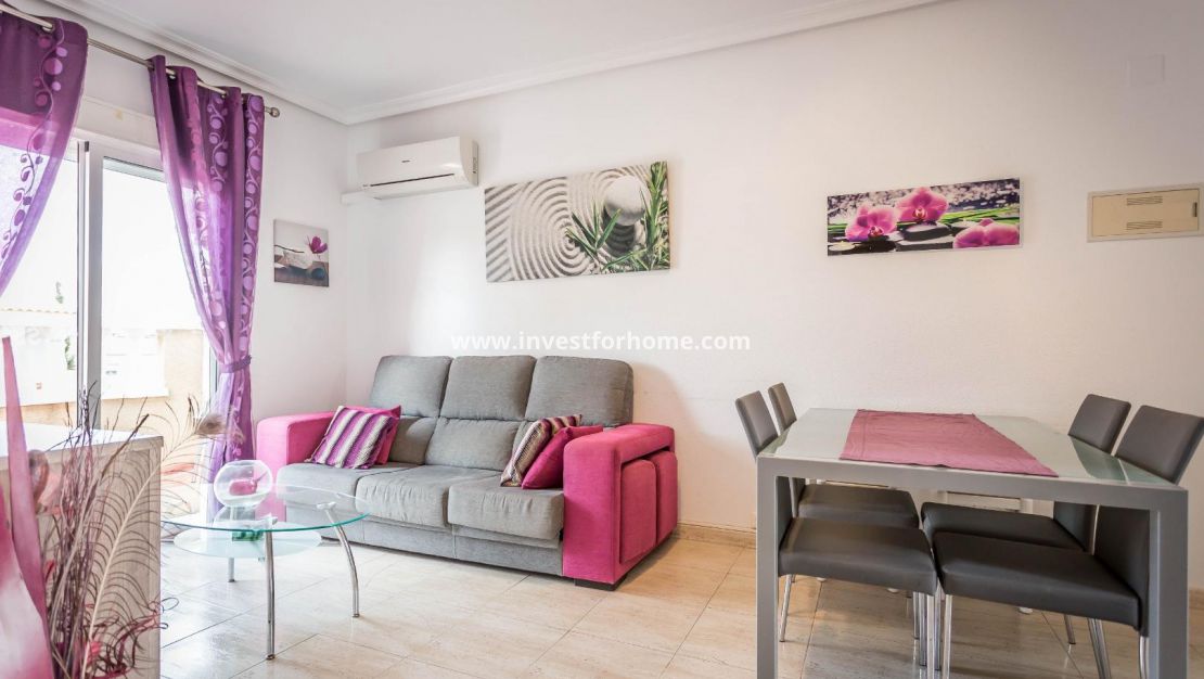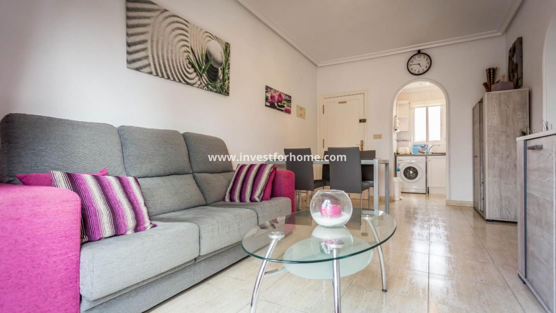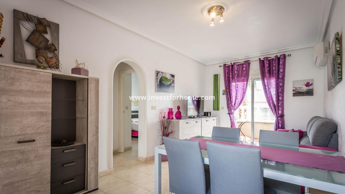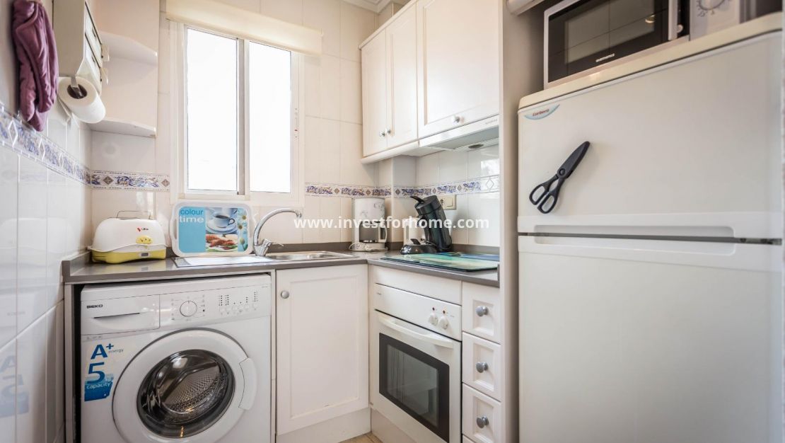 Lovely 2 bed 1 bath top floor apartment/Bungalow located in the residence of Las Margaritas, Torrevieja. The property is in good condition with a nice south facing balcony.The apartment is sold furnished with furniture and white goods. The residence is gated and boasts of a large pool and garden area . Close to Schools, Sea, Shops, Café, and Restaurants.