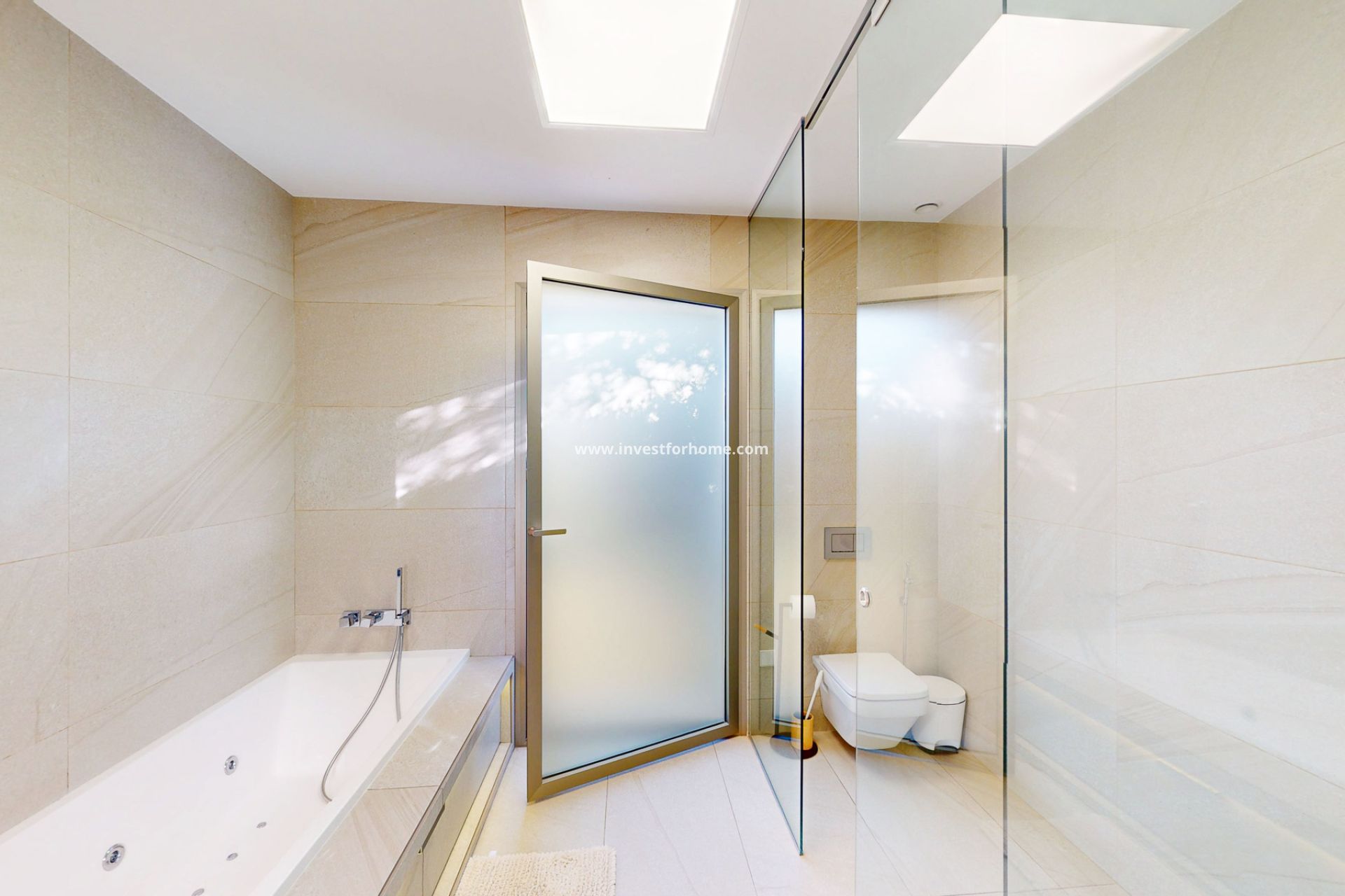 Modern Luxury Villa in Limonero, Las Colinas Golf and Country Club This stunning south-facing villa is located in the exclusive Limonero Community, with direct access to the award-winning golf course. Set on a 697 m² plot, it offers 260 m² of beautifully designed living space, a 45 m² solarium, and an elegant private pool running the length of the home. The main level features an open-plan living and dining area with a fully equipped designer kitchen, high-end finishes, and large sliding windows that seamlessly connect indoor and outdoor living. A stylish glass walkway leads to the master suite with private terrace, built-in wardrobes, and a luxurious en-suite with jacuzzi bath and walk-in shower. Two additional bedrooms on the lower level open directly to a spacious terrace and landscaped garden. This floor also includes a family bathroom, two storage rooms, and a large multipurpose space – perfect as a mancave or entertainment room. The outdoor areas are ideal for entertaining, with multiple terraces, BBQ zone, outdoor shower, and a panoramic rooftop solarium boasting views of the golf course and sea. Built in 2017 and sold fully furnished, the villa includes: Underfloor heating Air conditioning White goods Electric shutters Alarm system Solar panels Smart home system 2 private parking spaces An exceptional opportunity to own a turnkey luxury home in one of Costa Blanca’s most prestigious communities. About Las Colinas Golf & Country Club Las Colinas Golf and Country Club is a residential community, where exclusive villas and apartments are built around a championship golf course. The par-71 course is designed by renowned American landscape architect, Cabell B. Robinson and complemented with a short game area designed by golf legend Miguel Angel Jimenez. With its prime location and top-notch amenities, the resort has been honored with the title of "Leading Villa Resort in Spain and Europe" by the World Travel Awards. Features: · 18-hole par-71 Championship golf course · Restaurants and cafes · Fitness center, tennis, basketball, and volleyball courts · Spa and swimming pool · Store · Charging station for electric cars · WOW Beach-club, with swimming pool, restaurant and bar by the beach Distance to: · Alicante airport – 65 km, 50 min · Shopping center La Zenia Boulevard – 12 km, 16 min · Nearest supermarket – 6 km, 10 min · Beach club – WOW Beach, 9 km, 15 min · Yacht Club “Dehesa de Campoamor – 8 km, 15 min · Nearest hospital, Centro Medico Ribera Campoamor – 12 km, 16 min