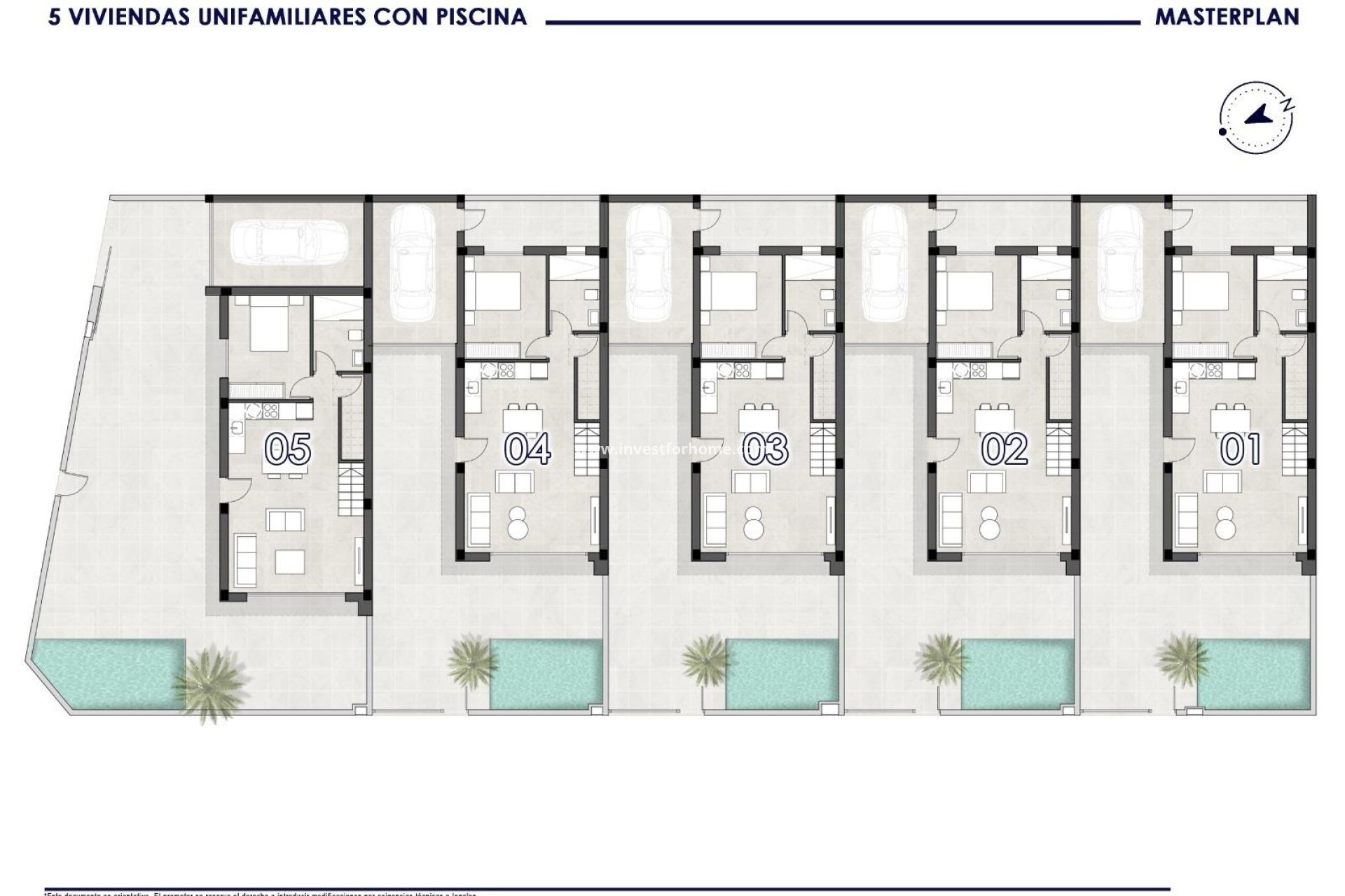 Nybyggda parhusvillor med privat pool i San Pedro del Pinatar Moderna bostäder i ett utmärkt läge Detta exklusiva bostadsområde med 5 parhusvillor ligger i San Pedro del Pinatar, en livlig kuststad på Costa Cálida. Beläget nära det kommunala idrottscentret, inom gångavstånd från stadens centrum och bara 3,5 km från stränderna vid Mar Menor och Medelhavet, erbjuder dessa bostäder den perfekta blandningen av komfort, bekvämlighet och medelhavslivsstil. Modern design och funktionell planlösning Varje villa är fördelad på två våningar och utformad med modern arkitektur som maximerar utrymmet och det naturliga ljuset. Med 3 sovrum och 2 badrum är dessa fastigheter idealiska för familjer, semesterbostäder eller investeringar. Bottenvåning: Öppen planlösning med kök i anslutning till det ljusa vardagsrummet och matplatsen, ett sovrum, ett badrum, en bakre uteplats och direkt tillgång till den privata trädgården med pool. Första våningen: Två ytterligare sovrum, ett badrum och en rymlig terrass med tillgång till det privata taksolariet, perfekt för solbad eller underhållning. Högkvalitativa ytbehandlingar och komfort Villorna levereras med högkvalitativa specifikationer och genomtänkta detaljer för att säkerställa ett modernt boende: Fullt möblerat och utrustat kök med vitvaror Privat pool och trädgård Taksolarium för utomhusliv året runt Sommarkök ingår Belysningspaket för interiör och exteriör Stängt privat garage San Pedro del Pinatar – Livsstil och omgivning San Pedro del Pinatar är känt för sitt soliga klimat året runt, sandstränder och naturlandskap som den berömda naturparken Salinas y Arenales. Staden erbjuder alla nödvändiga tjänster, inklusive butiker, stormarknader, restauranger, vårdcentraler och idrottsanläggningar, vilket gör den till en utmärkt plats för både permanent boende och semester. Avstånd till viktiga sevärdheter: Stränderna vid Mar Menor - 3,5 km Dos Mares shoppingcenter - 5 km Lo Pagán marina - 4 km Roda Golf - 8 km Murcia flygplats (Corvera) - 35 km Alicante flygplats – 75 km Säkra ditt nya hem vid havet Dessa nybyggda parhusvillor i San Pedro del Pinatar kombinerar modern design, högkvalitativa ytbehandlingar och ett privilegierat läge nära havet och alla bekvämligheter. Kontakta oss idag för mer information eller för att boka en visning och ta det första steget mot ditt drömhus vid Medelhavet.