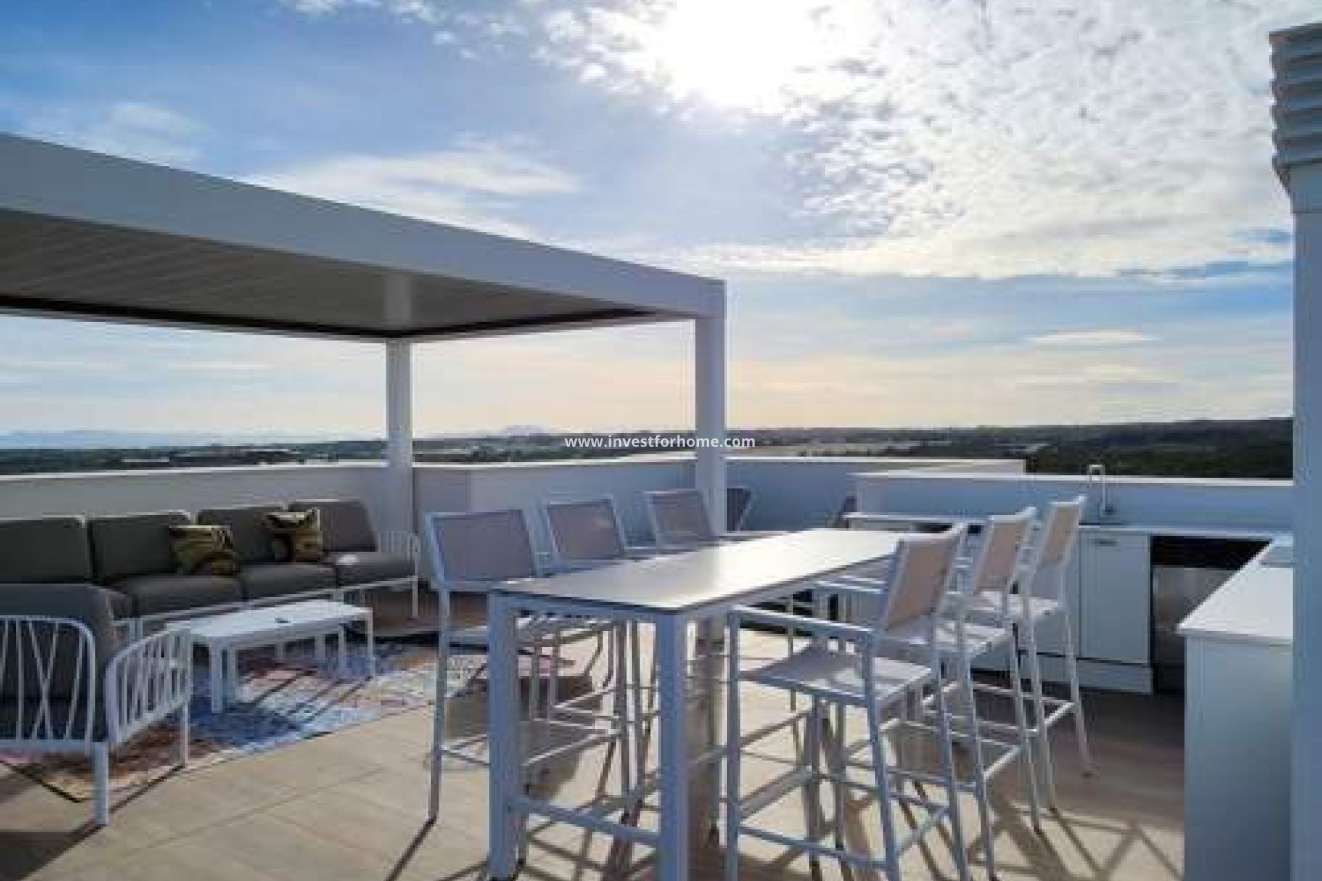 Denna helt nya, lyxigt inredda takvåning med spektakulär utsikt ligger på den prestigefyllda golfanläggningen Las Colinas. De tre möblerade sovrummen, rymligt och stilfullt vardagsrum, terrass och solarium i kombination med ett vackert medelhavslandskap och skyddat läge gör denna drömlägenhet till ett utmärkt val som bostads- eller lantbostad i Spanien.Genom att välja ljusa färger och eleganta möbler utstrålar alla 3 sovrummen (varav 1 med eget badrum) fridfull lugn och komfort.Vardagsrummet med öppet kök, barhörna och rymlig terrass (23m2) erbjuder en magnifik utsikt över golfanläggningen. Det moderna fullt utrustade köket med inbyggda skåp har diskmaskin med komfortlyftteknik, vattenfiltersystem, induktionshäll, vinkyl m.m.Elektriska fönsterluckor har installerats i varje rum för mer atmosfär och avskildhet. Ett optimalt inomhusklimat garanteras av en energieffektiv värmepumpsluftbehandlingssystem och kan styras separat för varje rum. Huset har en privat underjordisk parkeringsplats där en laddstation kan installeras om så önskas, ett stort förråd och en vacker gemensam pool.Den spanska semesterkänslan kan upplevas hela tiden på den rymliga takterrassen på inte mindre än 100 m2! med utekök, pergola, jacuzzi och 360 graders fri utsikt över naturlandskapet och Medelhavet. Uteköket (3x3,6m2) har gott om skåputrymme, bänkskiva i granit, induktionsplatta, diskmaskin och kyl. Det skjutbara taket på aluminiumpergolan (5x3m2) är elektriskt manövrerat och skapar en idealisk skuggplats.För att fullborda din vistelse kan du uppleva den ultimata känslan av att trivas i din egen jacuzzi: 5 personer, 102 hydrojets, LED-belysning och högtalare!Hur underbart skulle det inte vara att börja dagen med en ny kopp kaffe i baren eller avsluta den med en utsökt cocktail i solnedgången på din egen takterrass i medelhavsmiljö!