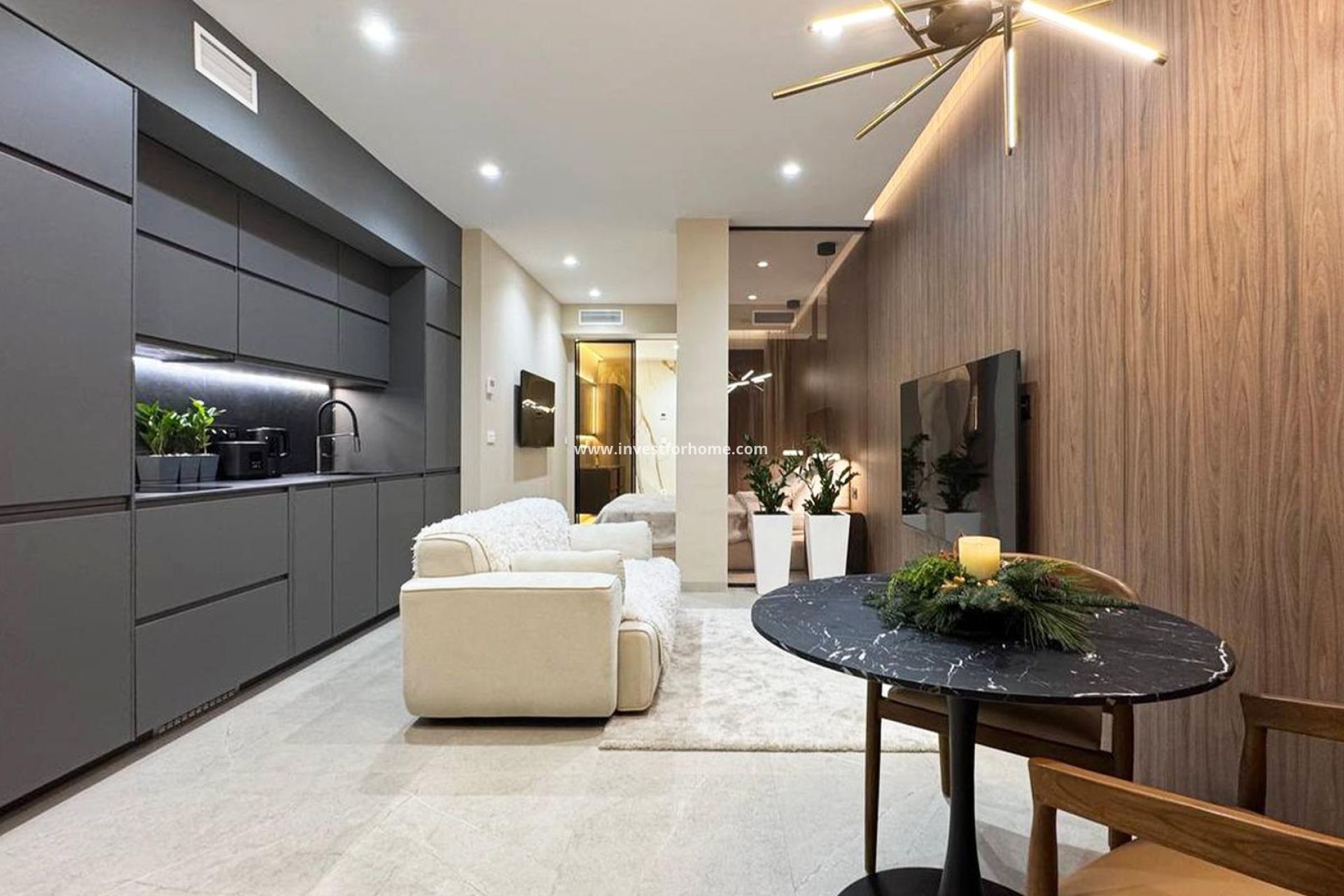 Stilig 1-rumslägenhet på 45 m² i hjärtat av Torrevieja, endast 250 meter från Los Locos-stranden. Lägenheten erbjuder ett ljust vardagsrum med panoramafönster från golv till tak, ett fullt utrustat modernt kök och ett bekvämt sovrum med inbyggd garderob och eleganta ytskikt. Badrummet har regndusch, stenhäll och golvvärme. Klimatkontroll, LED-belysning och privat terrass kompletterar denna sofistikerade medelhavsoas – perfekt som semesterbostad eller permanent bostad under den spanska solen.