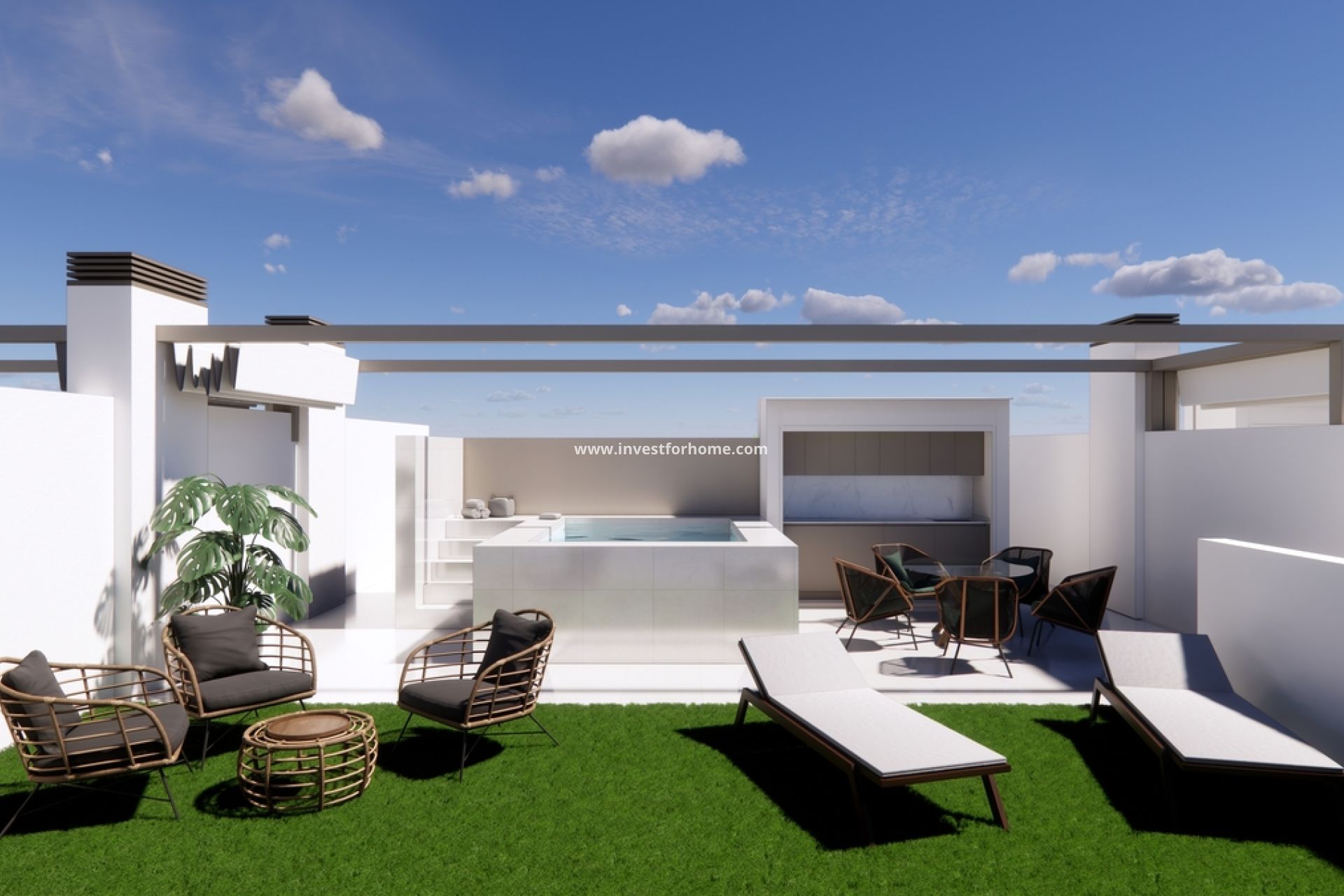 Utomhusområdena i dessa bostäder är utformade för att maximera njutningen av det medelhavsklimatet. Varje bungalow har en privat terrass, perfekt för att koppla av utomhus eller njuta av måltider al fresco. Dessutom erbjuder ett solarium extra utrymme för solbad eller bara för att njuta av utsikten över omgivningarna. För dem som värdesätter integritet har vissa enheter privat pool, vilket gör hemmet till en personlig oas. Inkluderingen av en jacuzzi ger en touch av lyx och välbefinnande, vilket möjliggör avkopplande stunder i hemmets komfort.