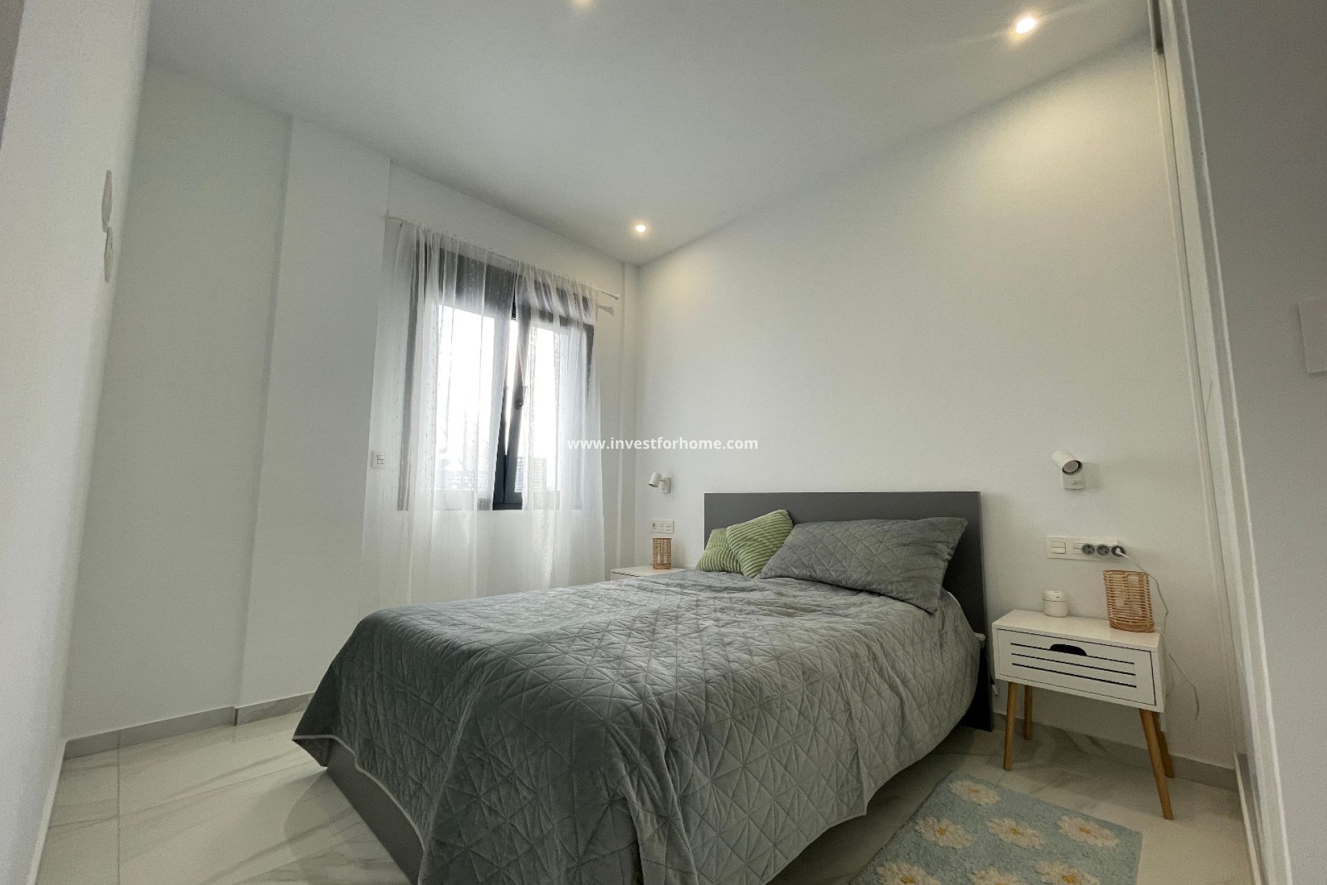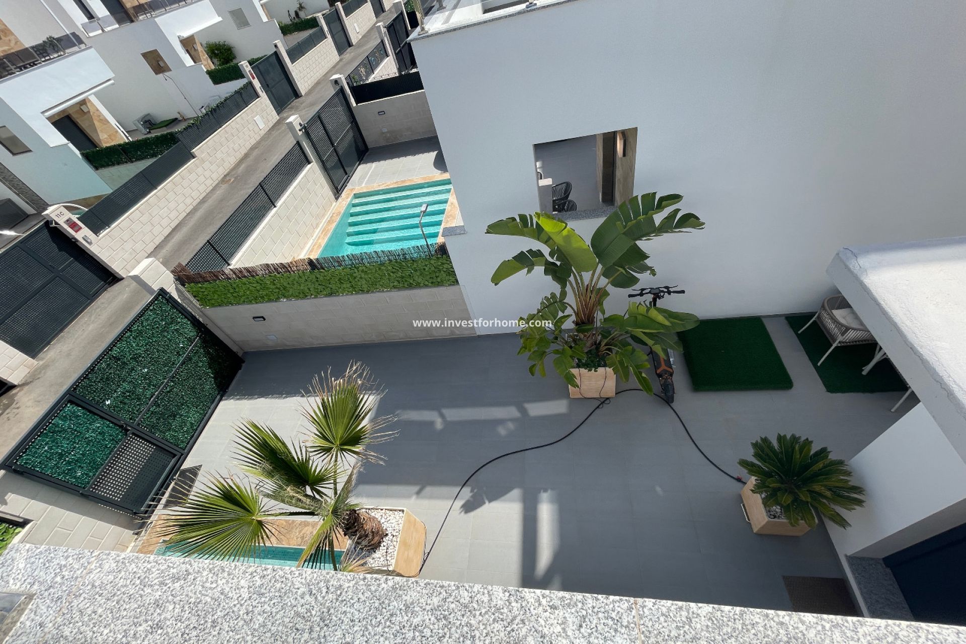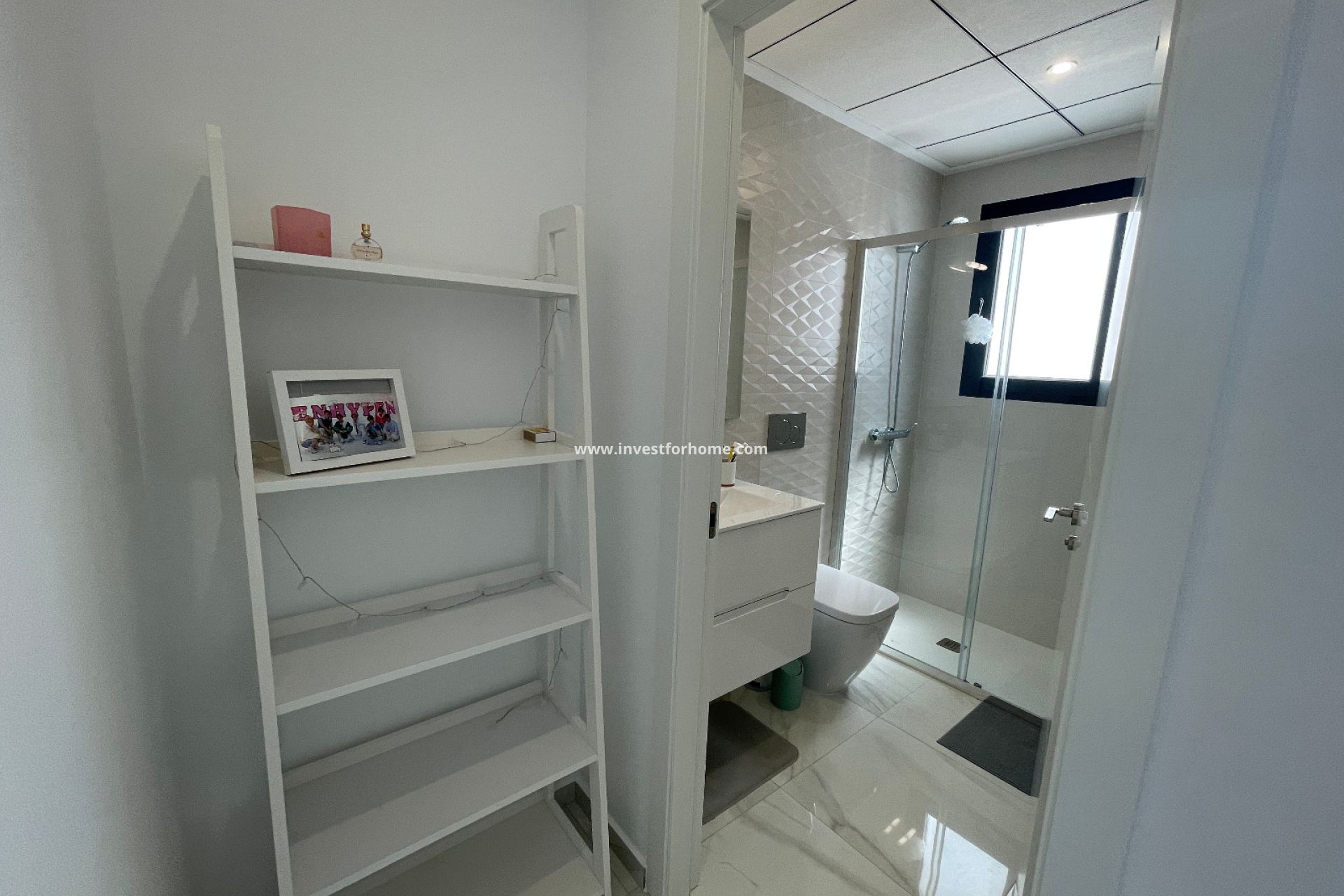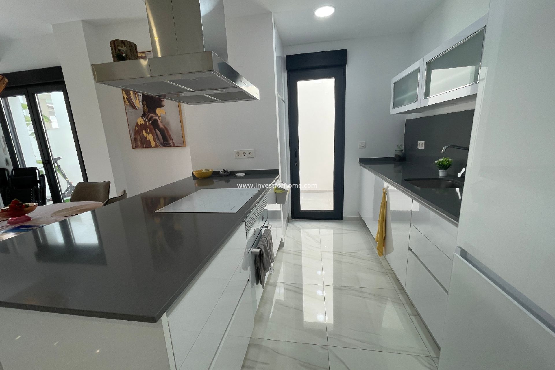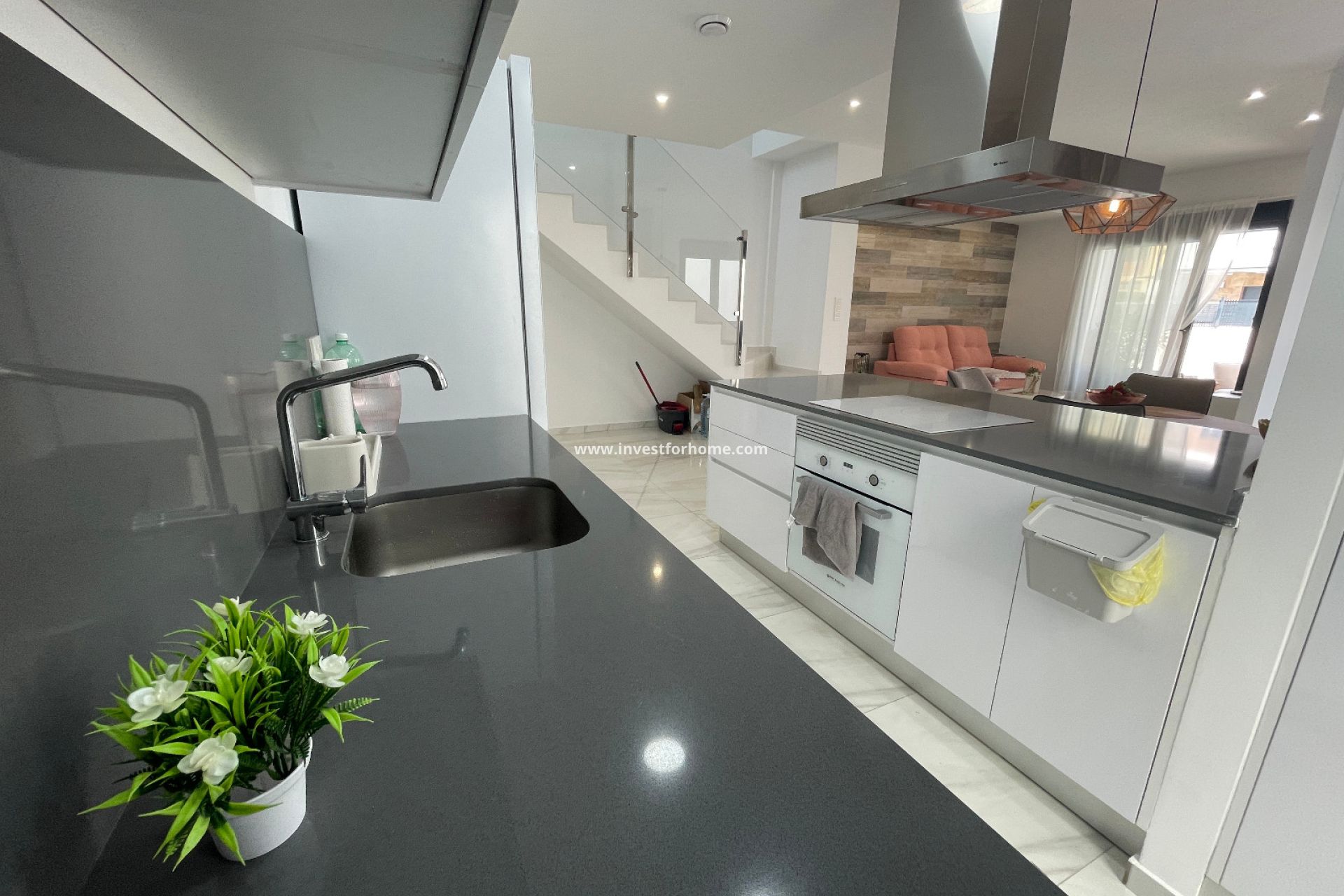 Denna fantastiska villa är i utmärkt skick och erbjuder en modern design med fokus på komfort och stil. Den öppna planlösningen med vardagsrum, matsal och kök skapar ett ljust och inbjudande utrymme – perfekt för både vardagsliv och sociala tillställningar. På bottenvåningen finns ett rymligt sovrum med inbyggda garderober samt ett komplett badrum. På övervåningen leder en mysig hall ut till en liten terrass – idealisk för morgonkaffet eller en stunds avkoppling. Det andra sovrummet har ett elegant badrum en suite. Längst ner i hallen finns mastersovrummet med eget badrum och direkt tillgång till en solig privat terrass – perfekt för att njuta av det härliga medelhavsklimatet. Villan har luftkonditionering och är inflyttningsklar – här kan du njuta av hög komfort och kvalitet från första dagen. Benijófar ligger i hjärtat av Costa Blanca och är en charmig och välansluten stad i Alicanteprovinsen. Här möts traditionell spansk charm och moderna bekvämligheter. Bara en kort bilresa från stränderna i Guardamar och Torrevieja och med alla nödvändiga bekvämligheter på gångavstånd, är det ett perfekt val för både permanent boende och semester.