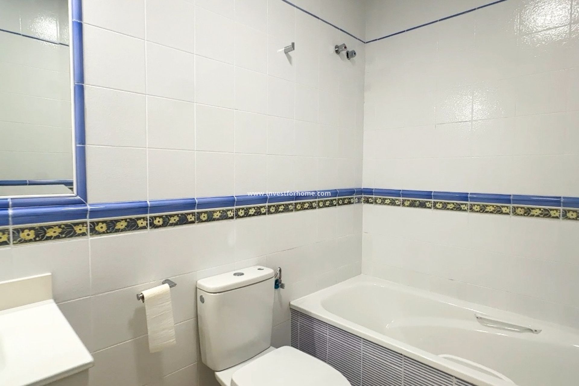 Vacker parhusbungalow belägen i Orihuela Costa, Villamartín, i Los Dolses-området, Rioja V bostadskomplex. Ett väletablerat område, bara 10 minuter med bil från stränderna i La Zenia eller Cabo Roig. Omgivet av tre prestigefyllda golfbanor (Villamartín, Las Ramblas, Campoamor). Området är känt för sin närhet till La Rioja köpcentrum (som inkluderar en Dialprix-stormarknad och restauranger), Villamartín Plaza köpcentrum, och Zenia Boulevard köpcentrum. Utmärkt tillgång till motorvägen N332 och motorvägen AP-7, vilket underlättar åtkomst till Alicante (45 min) och Murcia flygplatser. Denna tvåvånings parhusbungalow har en privat fram- och bakgård samt ett solarium på övervåningen. Renoverad och fullt möblerad. Inflyttningsklart. Den har ett vardagsrum med matplats och öppen spis, ett kök med frukostbar med helt nya skåp (över- och underskåp, bänkskiva i granit , fläkt i rostfritt stål, keramikhäll, ugn och elektrisk varmvattenberedare ), ett komplett badrum och två stora sovrum, båda med inbyggda garderober . Övervåningen, som nås via en utvändig trappa, har ett solarium på 36,67 m², varav en del är täckt, med belysning och vattenanslutning. Den har split-system luftkonditionering i vardagsrummet, takfläktar i sovrummen och centralvärme med radiatorer och varmvatten från en gaspanna. Gasanslutning är för närvarande inte ansluten. Komplexet har välskötta gemensamma trädgårdar och två poolområden varav ett ligger framför baksidan av vår bungalow.