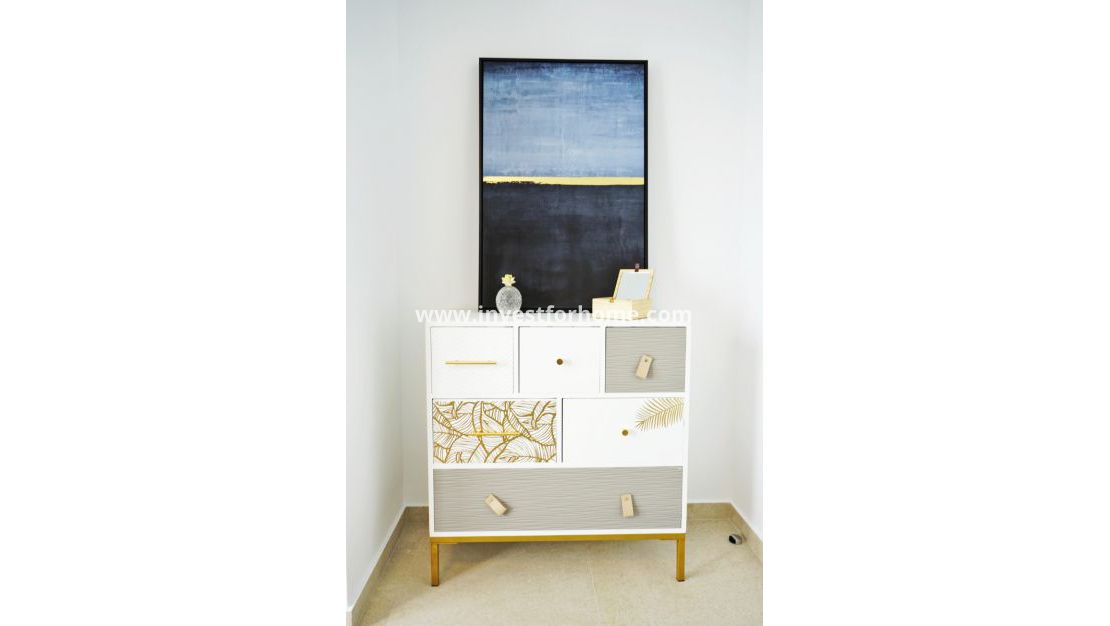 Dessa nybyggda villor ligger bredvid golfbanan på Costa Blanca och består av 3 rymliga sovrum och 3 badrum, med en total bostadsyta på 110 m2, stor terrass, byggd på en tomt mer än 200 M2 och möjligheten att inkludera privat pool för en extra kostnad på 12500 € + moms På bottenvåningen öppen planlösning - matsal, utrustat kök, 1 sovrum, badrum och på första våningen, 2 sovrum badrum.