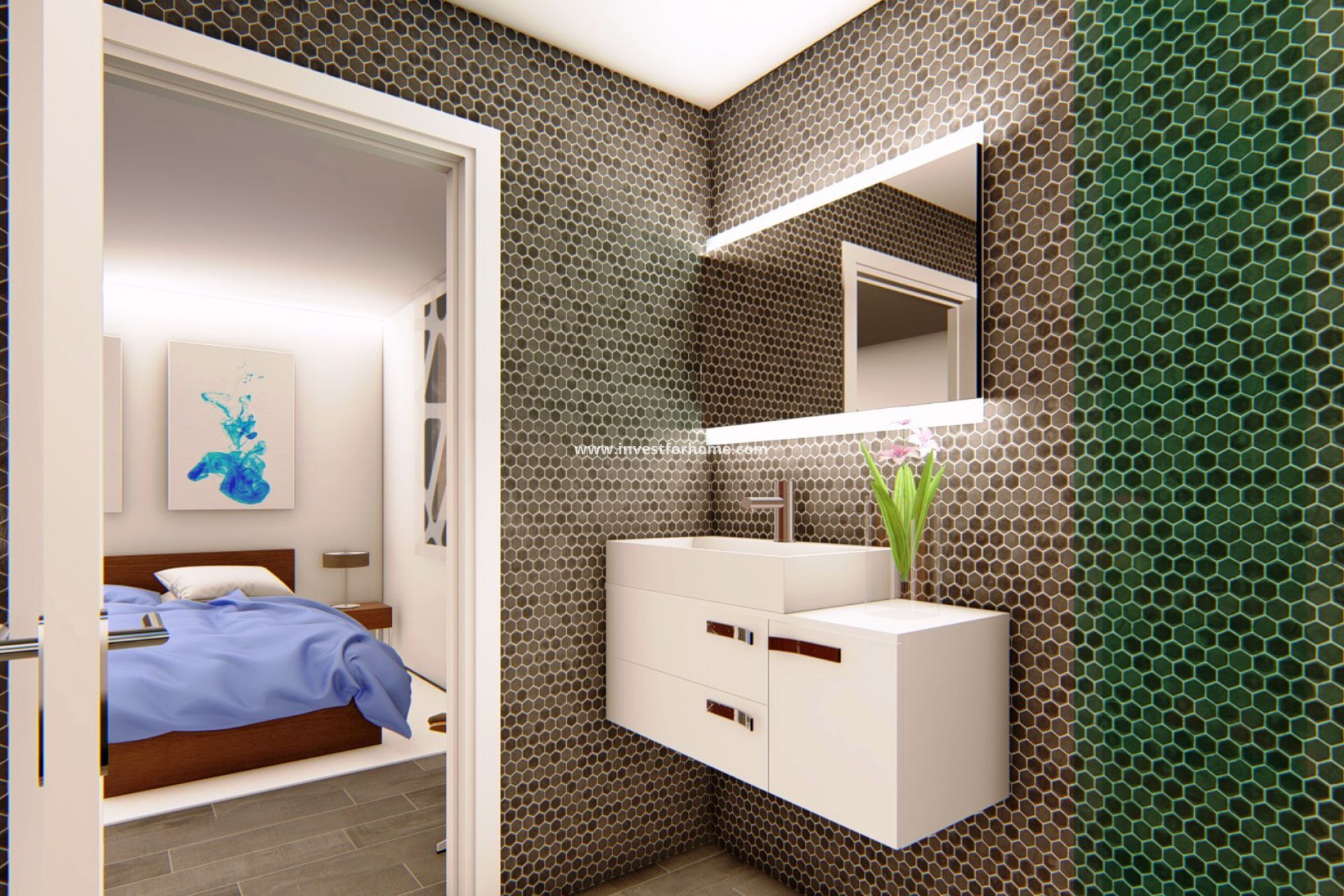 Denna fristående villa på en våning är uppdelad i ett stort vardagsrum med öppet kök. Den har 3 sovrum och två badrum, varav ett har eget badrum med sovrummet.