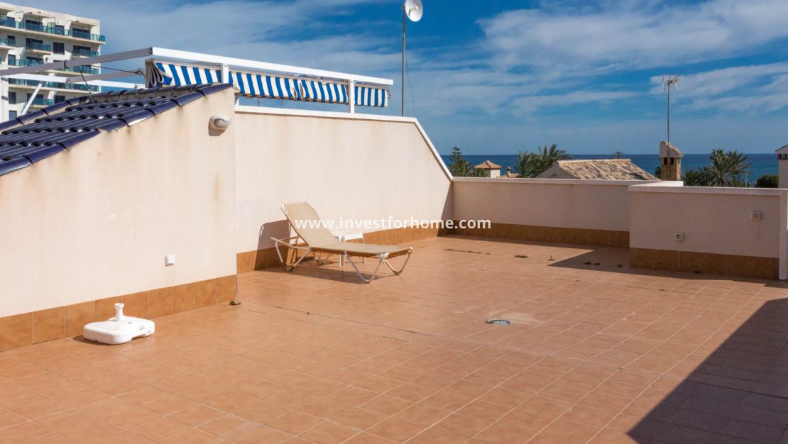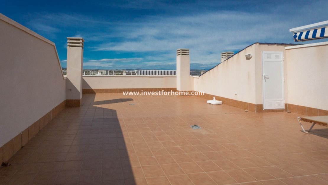 Vacker takvåning i La Veleta i utkanten av Torrevieja, bara 200 meter från havet med spektakulär utsikt från det privata privata tak terrass och nära till alla bekvämligheter, till exempel stormarknader, skolor, apotek och mycket nära universitetssjukhuset i Torrevieja. lägenheten är rymlig och i gott skick bestående av 2 sovrum, varav en-suite , ett familjebadrum, ett separat fullt möblerat kök och en stor terrass. Det finns också en pool, privat underjordisk parkeringsplats och ett stort förråd. Lägenheten kommer att säljas möblerad. Denna lägenhet på grund av sin plats är perfekt för året runt bo eller som en semesterinvestering. Det finns också en lägenhet med 3 sovrum till salu i bostaden med samma layout för 185500 €