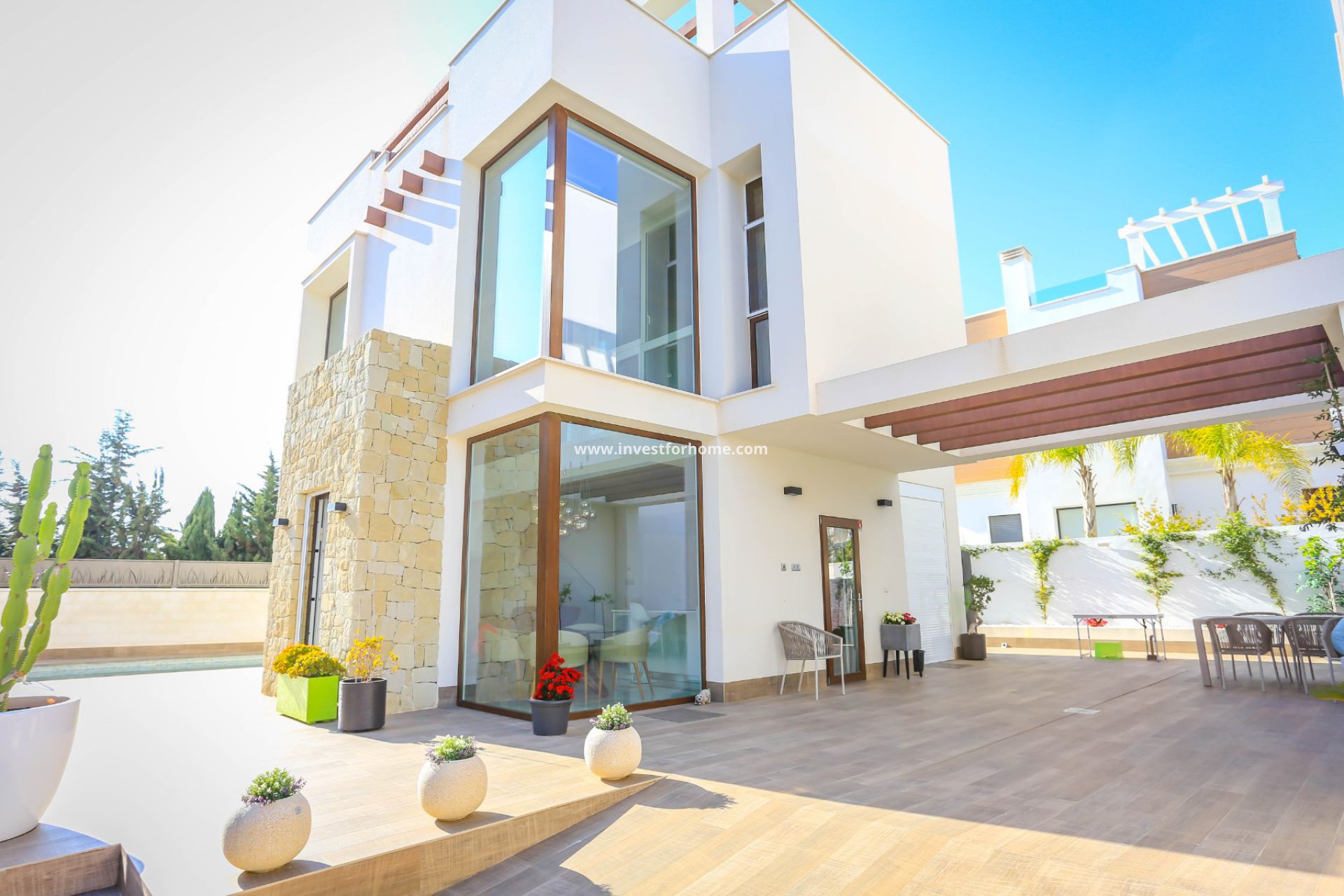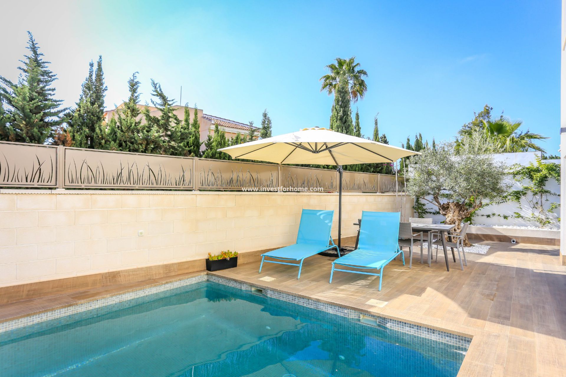 Nästan ny! Fantastisk modern villa byggd i 2018 med privat pool. Beläget i ett mycket populärt bostadsområde i Ciudad de Quesada (Rojales). Villan består av 3 stora sovrum, 3 badrum, ett stort vardagsrum med ett öppet fullt utrustat kök och tillgång direkt till terrassen och poolområdet. Tomtens yta är 282M2 som inkluderar en trädgård med en privat pool som mäter 7 x 4 och en parkeringsplats. Villan säljs fullt möblerad och i perfekt skick. Ciudad Quesada är ett exklusivt bostadsområde som huvudsakligen består av enskilda villor. Ciudad Quesada ligger bara 5 km från sandstränderna i Guardamar, El Moncayo och La Mata. Lite längre bort hittar vi stränderna i Torrevieja och Orihuela Costa, där de berömda köpcentrumen Habaneras och La Zenia Boulevard ligger. Omgiven av golfbanor som La Finca, La Marquesa, Villamartín, Las Colinas och Campoamor Golf. Att bli sedd